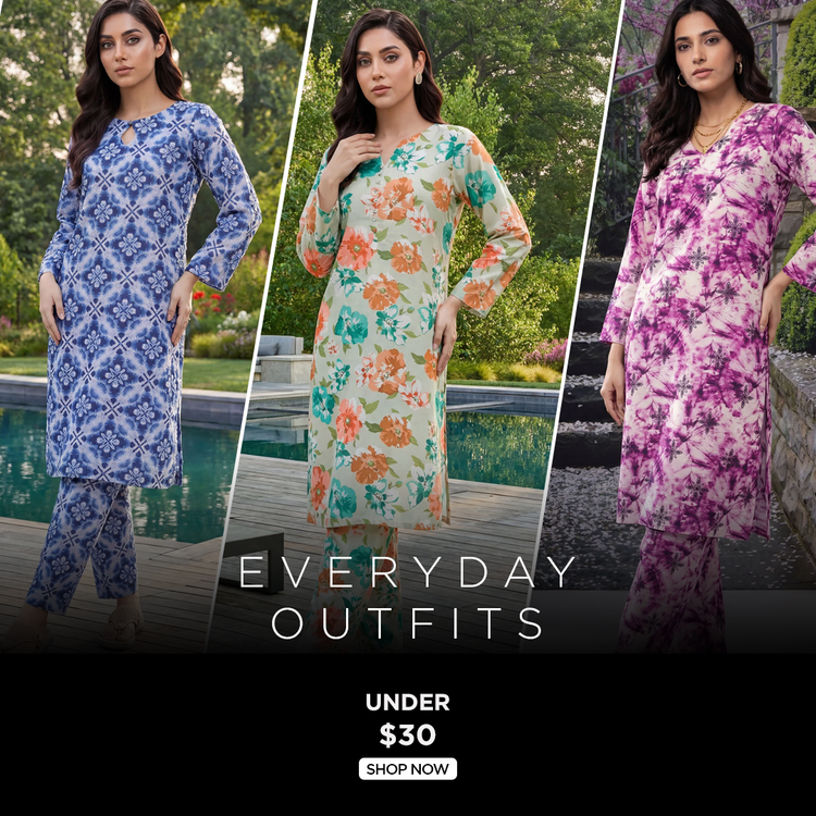 Our 1-piece suits are perfect for daily wear, offering effortless style, comfort, and elegance, made from breathable, soft materials. 2-piece and 3-piece suits are matching outfits ideal for festivals, formals, and loungewear. In our Eastern pret wear clothing collection, you can find the perfect shirt, trousers, and stole for any occasion.