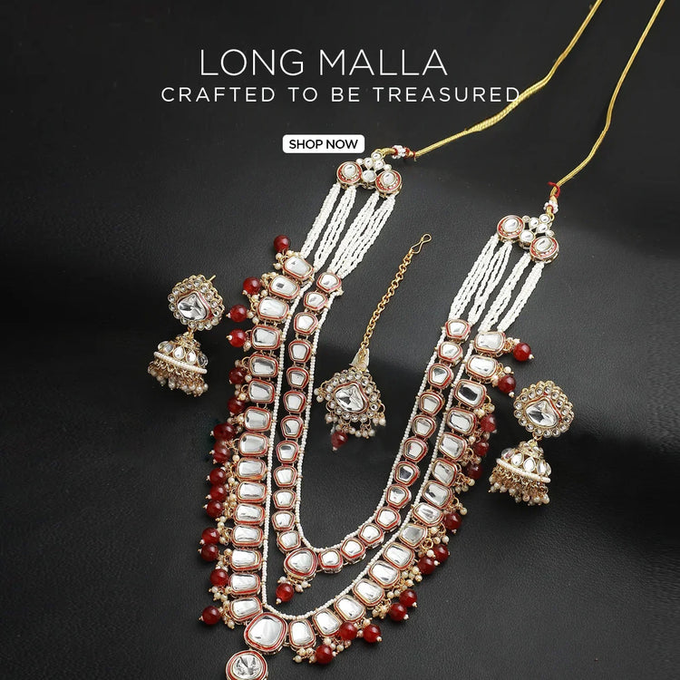 Maranta Malla Set features a multi-layered bead strand design is a masterpiece of royal elegance. This multi-layered necklace is adorned with finely cut Kundan stones and delicate pearls. It offers a complete and traditional look. Perfect for weddings and festive occasions. Specification. Malla Necklace...- $ 55.04