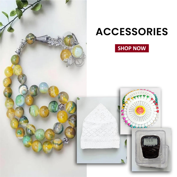 Whether you're in search of a prayer-ready tasbeeh or a neutral-toned cap to match your everyday hijab, our accessories are built for the modern Muslim woman, balancing beauty, function, and faith.