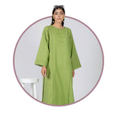 Women's light green two-piece outfit featuring a straight-cut kurta with loop-button detailing and matching trousers. The minimal design is complemented by subtle stitching, offering a refreshing and elegant look Colour: Olive Green Fabric: Premium Slub Khaddar *The model is wearing a small size. Disclaimer:...- $ 21.66
