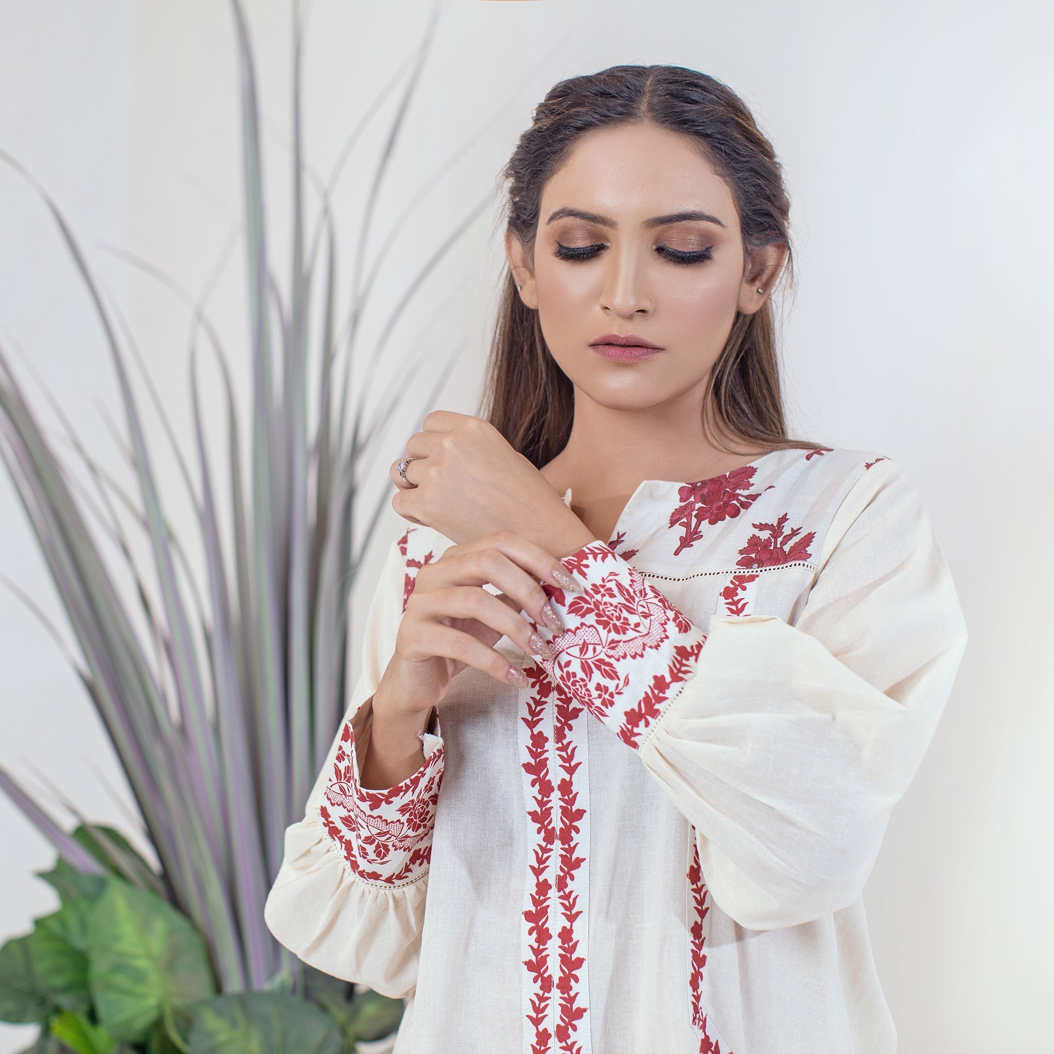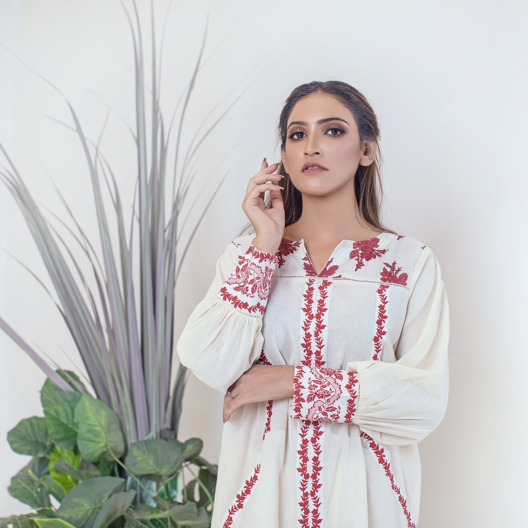 This dress showcases a vibrant pink floral print with delicate patch work details . The flared sleeves add a breezy feel. With a flowing neck lace, it's perfect for casual gatherings, offering effortless style and comfort.