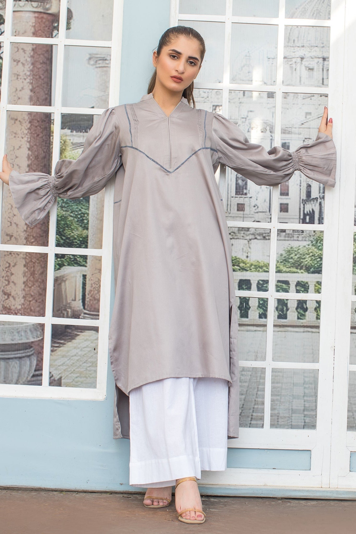 Embrace effortless elegance with this stylish Grey Long Dress. Featuring vibrant lace and Pleat work along the neckline, and smoked sleeves. This long-sleeve dress is perfect for festive occasions Ladder Lace work at York V Shape with Six Pleats. Piping work at Neck Line , Smoking at Sleeves 100% Cotton Satin / Gentle Wash , Cool Iron |