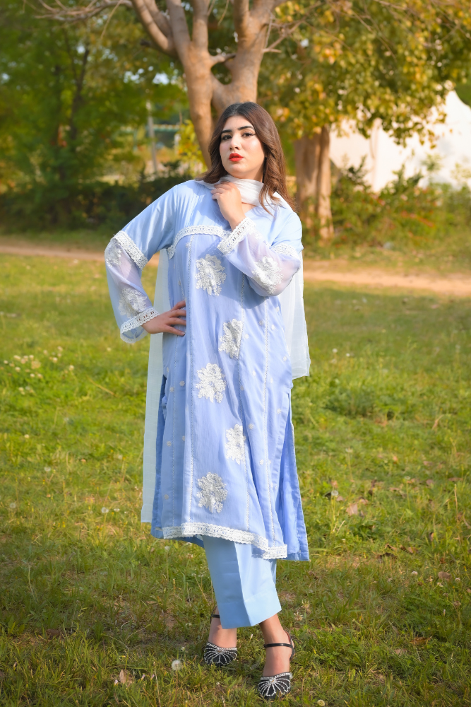 Solid Embellished one-piece set, fully embroidered front and back top in chiffon fabric