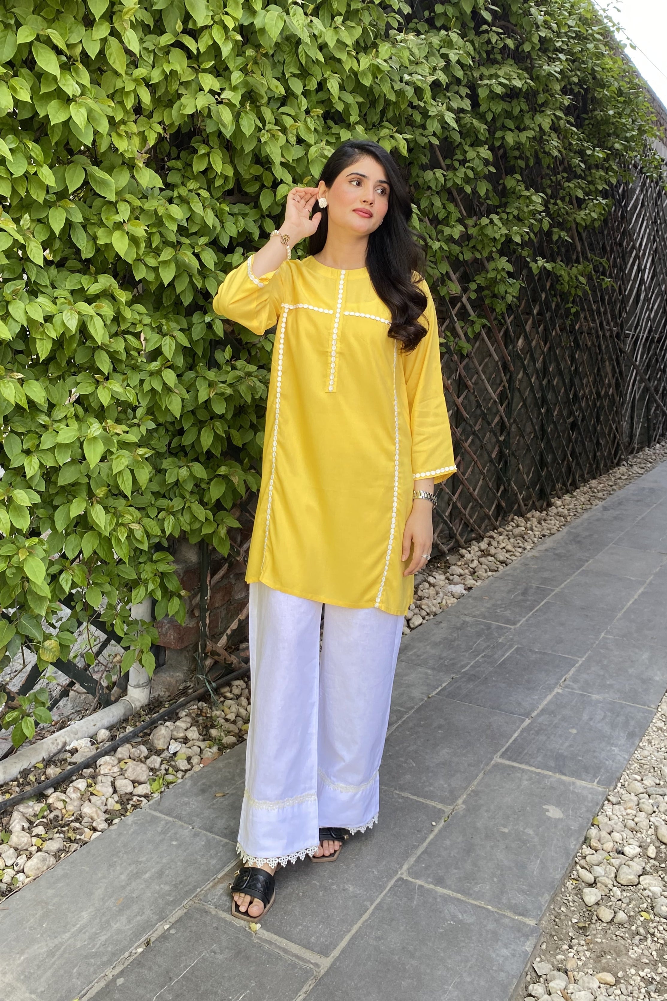 This 1-piece shirt is perfect for an everyday look, featuring embroidered white laces on the body, sleeves, and panels. Combining style with comfort, this shirt offers a soft, breathable feel thanks to its cotton viscose blend. Ideal for casual wear, it adds a touch of elegance to your daily wardrobe.