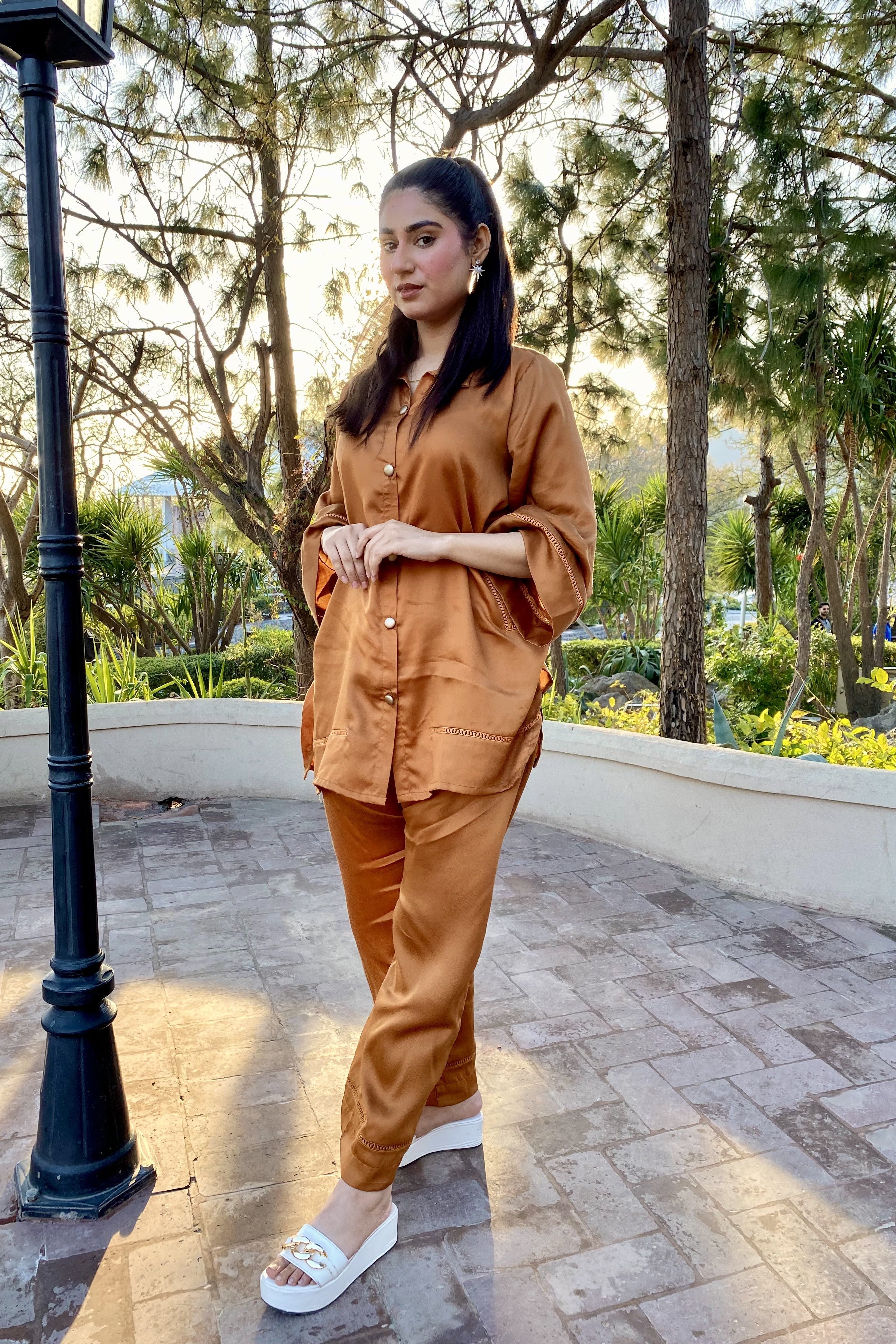 This elegant rust long co ord set is a timeless blend of luxury, perfect for both casual and formal occasions . The rich, deep rust hue brings depth to the ensemble with embroidered laces at body, while the subtle sheen of the fabric catches the light, adding an element of refinement. The outfit includes a matching TROUSER , adding an extra layer of coziness and grace.