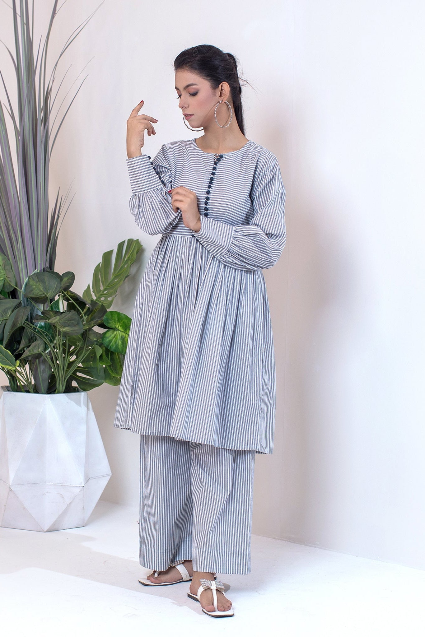 Embrace timeless style with this sophisticated striped shirt, featuring detailed embellishments of punched buttons on cuffs and a chic neckline, perfect for any occasion. Pleated Body with stripes , 18 punched buttons at placket and 12 punched buttons at Cuff 100% Cotton / Gentle Wash , Cool Iron |