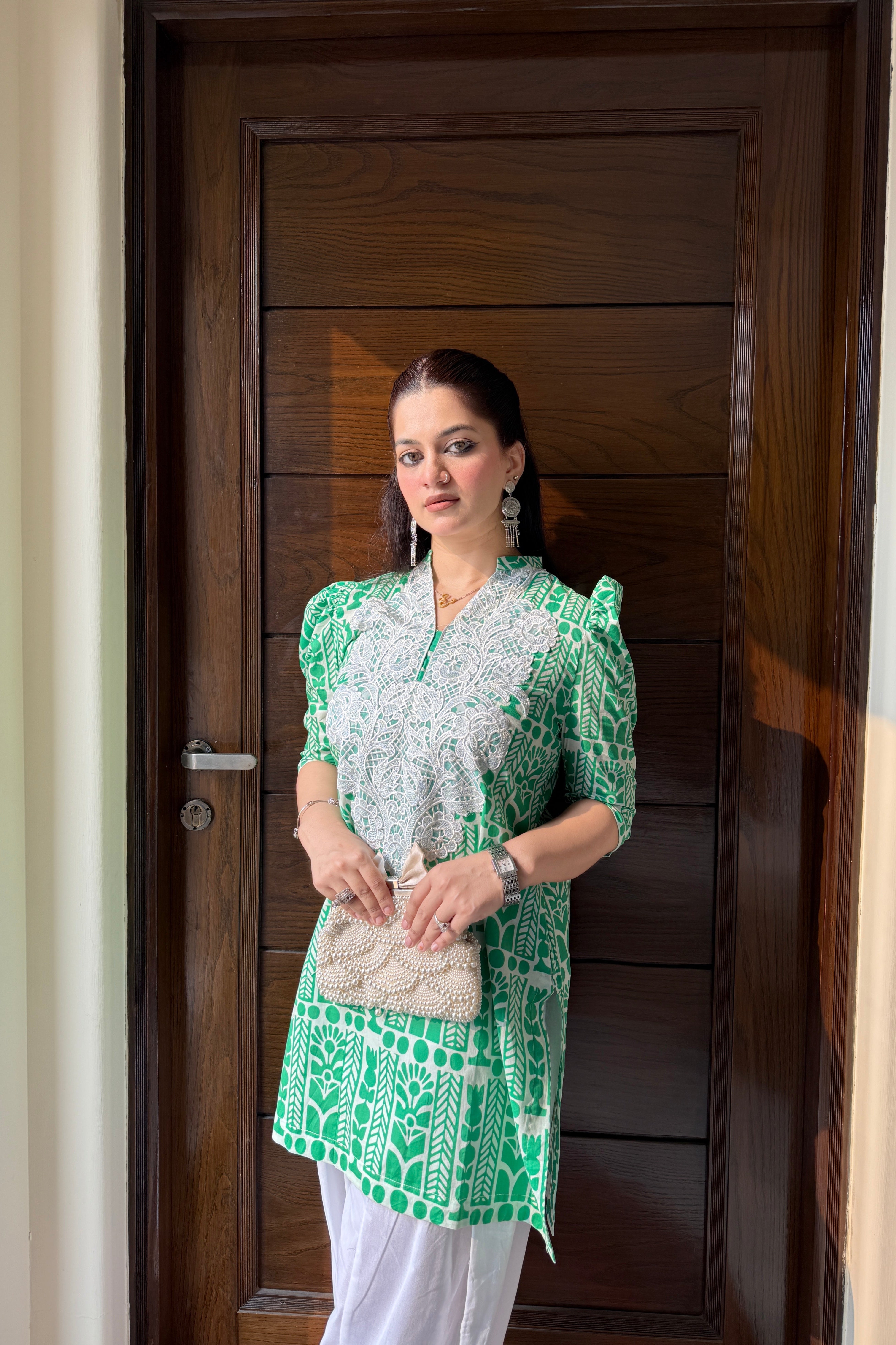 Introducing abstract print from our Lawn collection â?? where playful meets polished! This outfit boasts whimsical embroidery gracefully adorning our applique cut kameez adding a charming touch to the neckline. Paired with our farashi ivory shalwar, it takes the entire look to new heights.