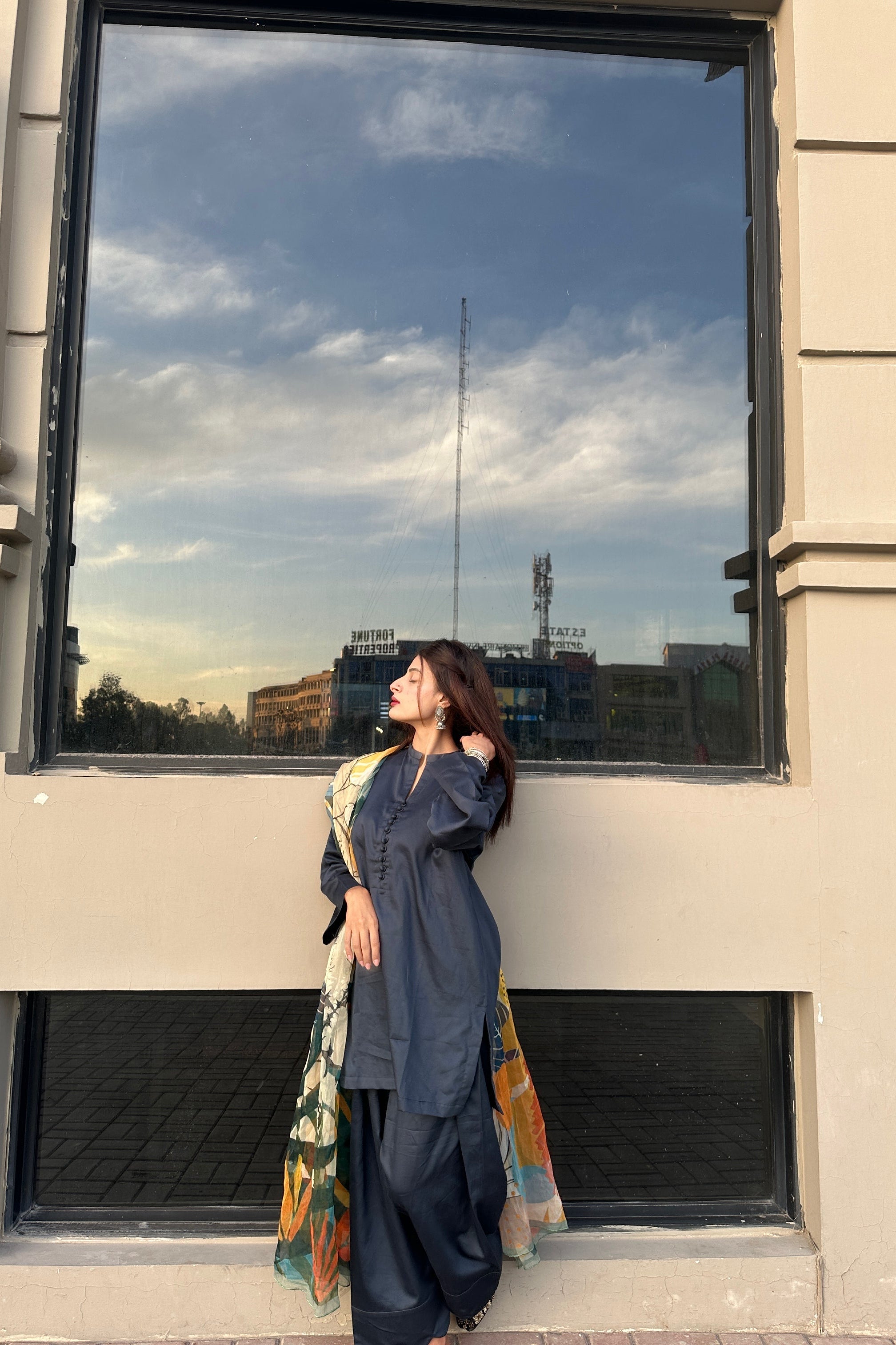 This outfit boasts whimsical soft satin cotton weave, complete with customized fabric wrapped round buttons that add a charming touch to the neckline. Paired with our iconic Farshi Slawar , it takes the entire look to new heights.