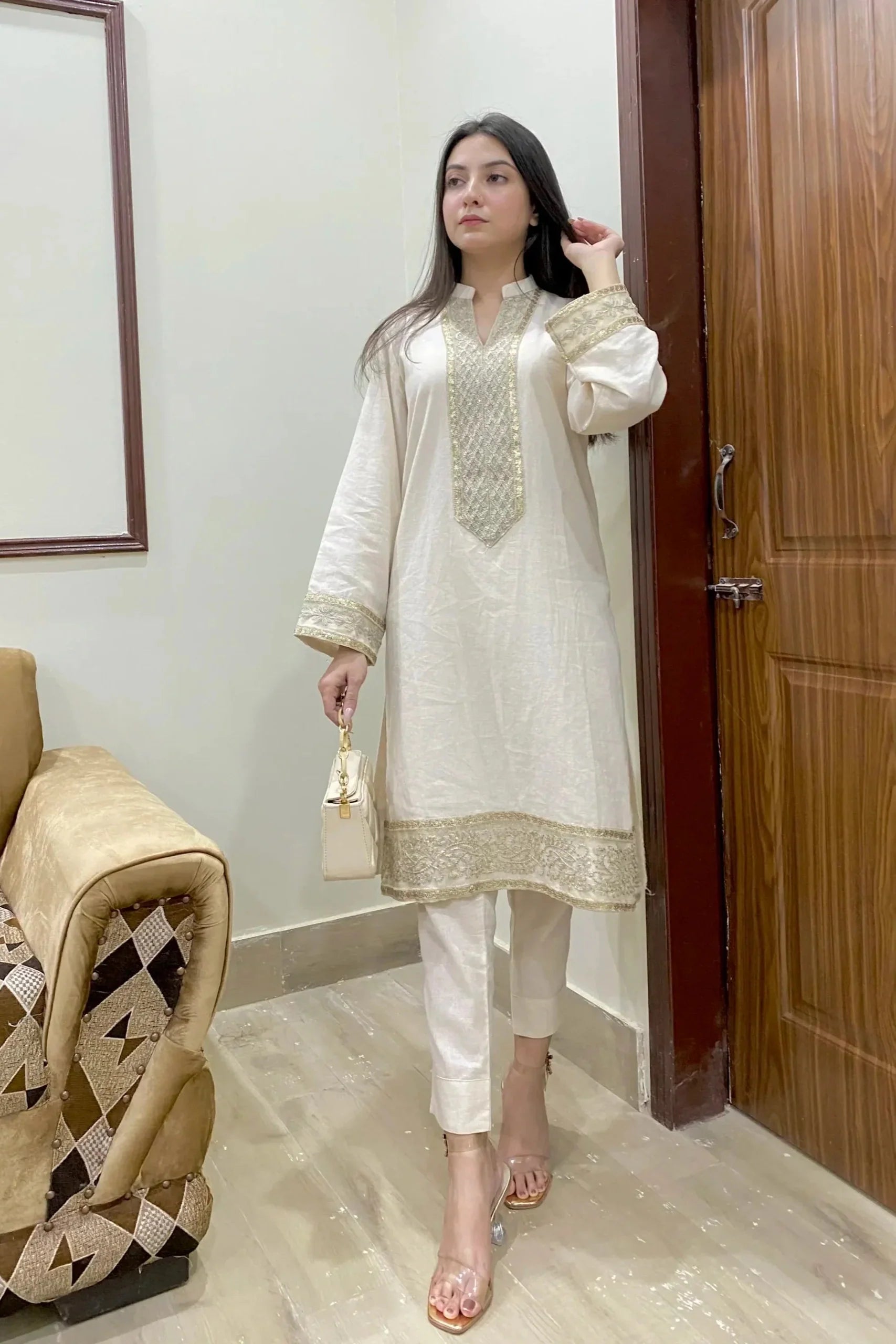 Glory cream embroidered, impressive Zari, and sequence work at neck, sleeve, and daman for a luxury look.