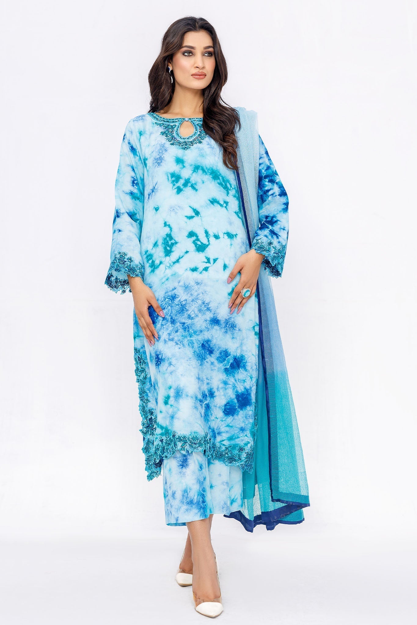 Keeping the tradition alive, this tie & dye outfit in dull silk is embellished with embroidery. The gorgeous blend of colors offer sophistication, creating a visually interesting ensemble.