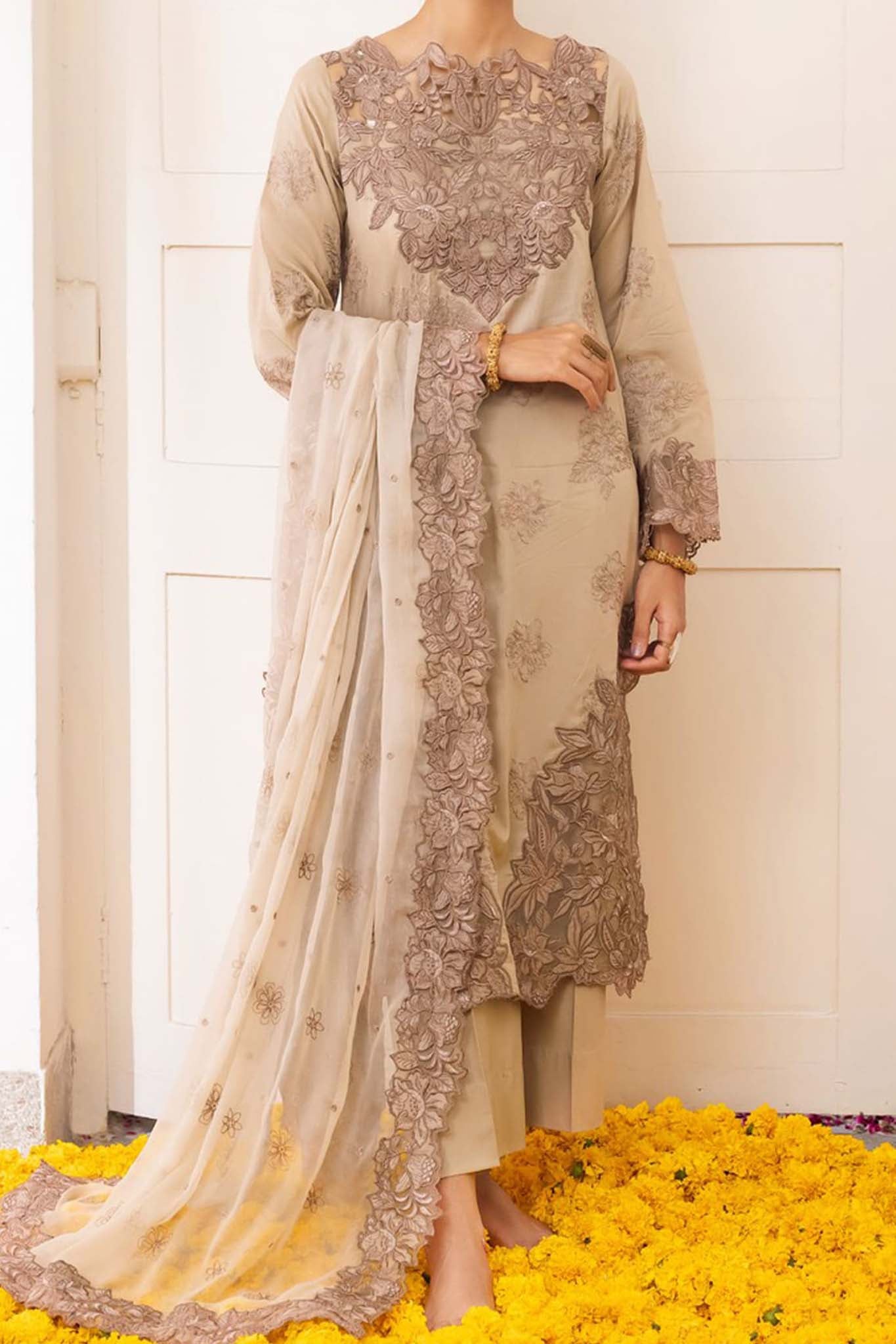 Shirt Front: Embroidered Lawn (1.25 M) Shirt Back: Dyed Lawn (1.25 M) Neckline: Embroidered Organza (1 Piece) Shirt Patches: Embroidered...