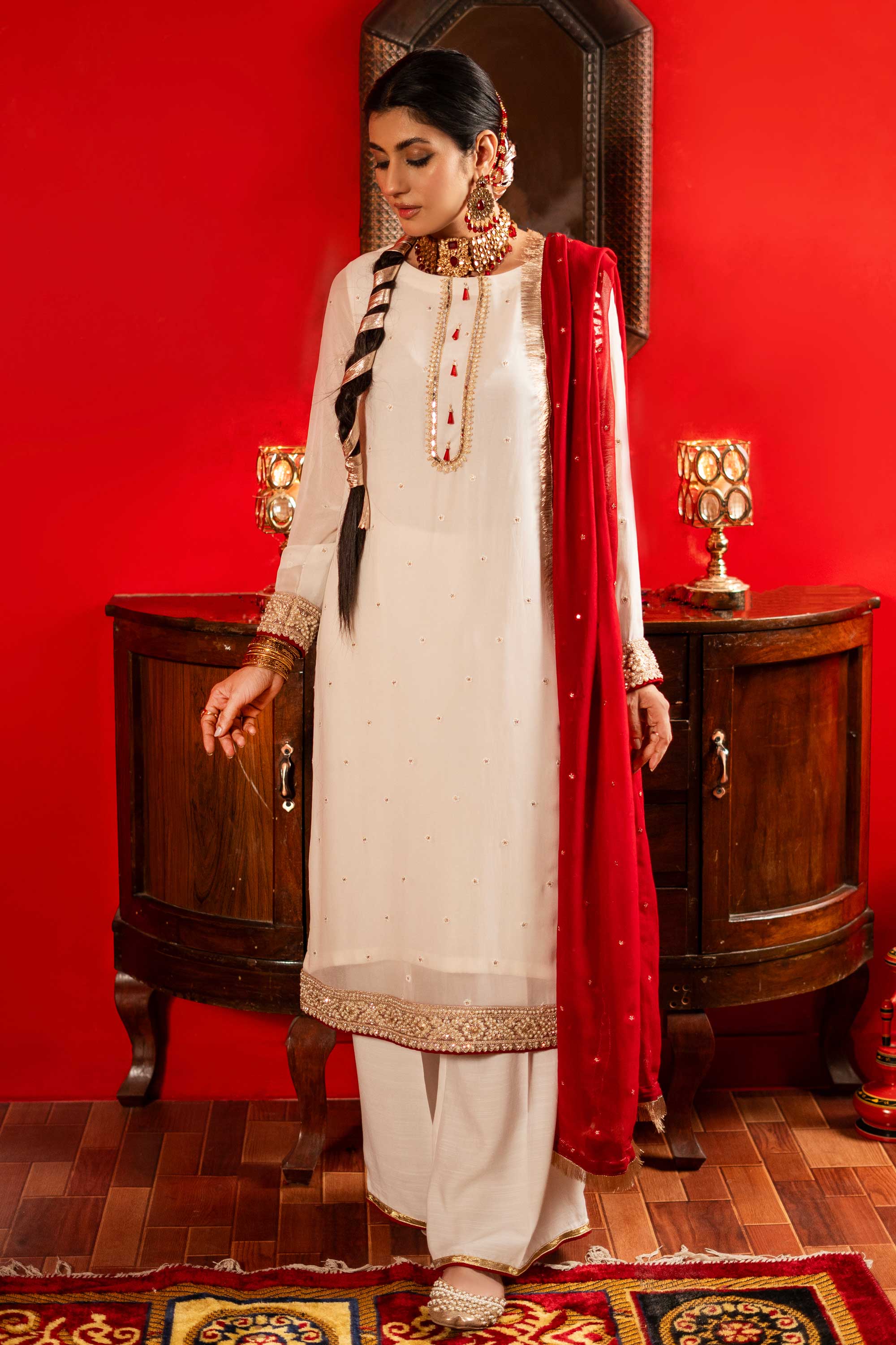 Gender: Women Category: Clothing Season: All Season (Formal Wear) Outfit Type: Eastern Color: WhiteNumber Of Pieces: 3 Piece Dupatta Fabric: Chiffon Shirt Fabric: ChiffonTrouser Fabric: Pk...