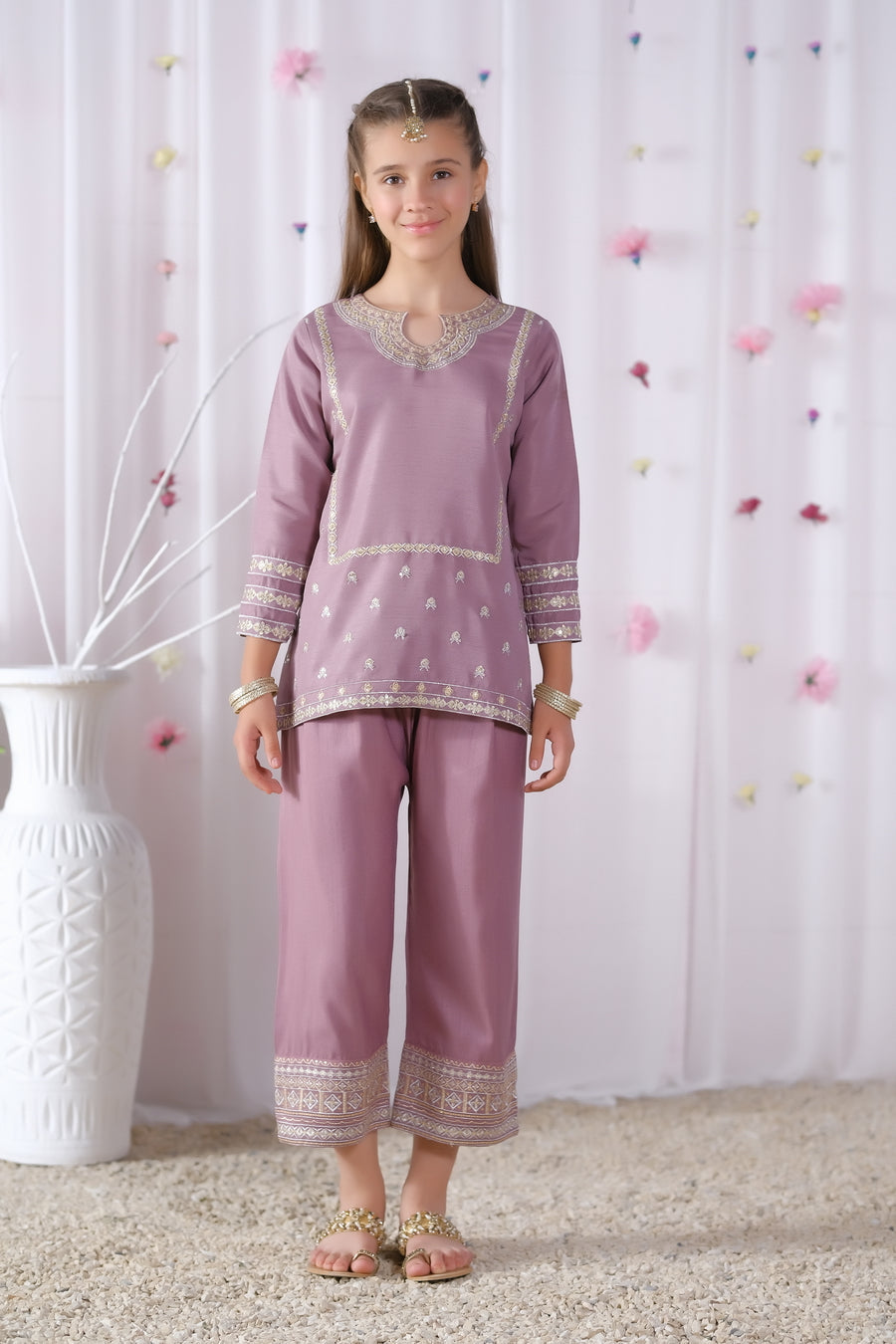 Introducing "Abeeha," a chic mauve two-piece outfit for girls that exudes elegance and sophistication. The short-length top paired with capri pants offers a modern twist to traditional attire. Adorned with intricate silver and white embroidery, this ensemble is perfect for making a statement at any special occasion, showcasing timeless charm with a contemporary flair.