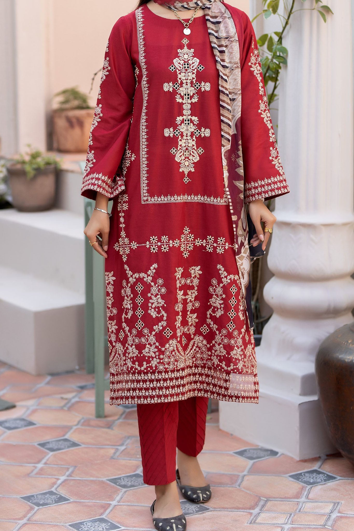 Embroidered Lawn Front 0.8 Mtr Embroidered Lawn Back 0.8 Mtr Embroidered Lawn Sleeves 0.66 Mtr Dyed Cotton Trouser 2.5 Yard...