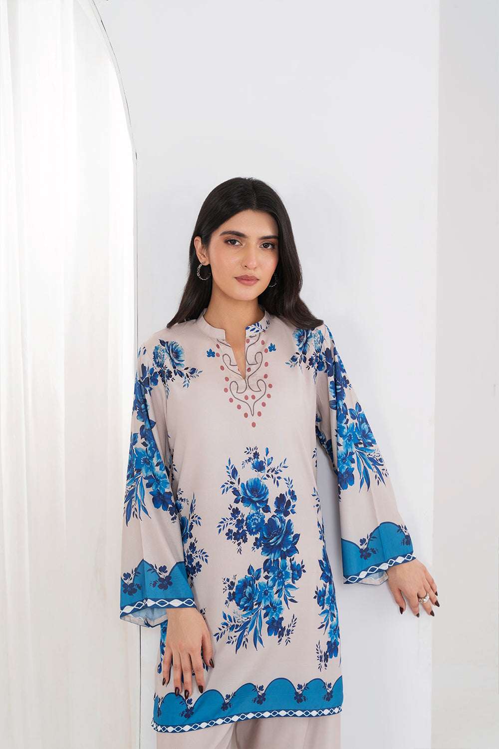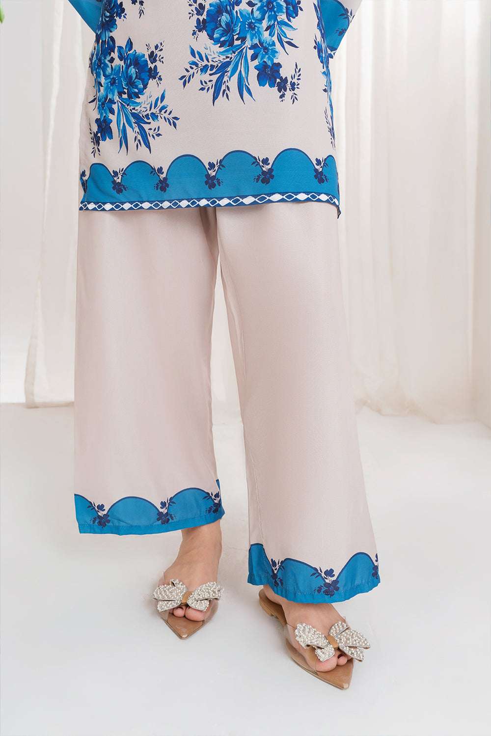 Grace meets serenity in this 2-piece stitched set, featuring a soft beige base adorned with striking cobalt blue floral prints. The long shirt is detailed with delicate borders on the sleeves and hem, perfectly paired with straight trousers for a refined look.