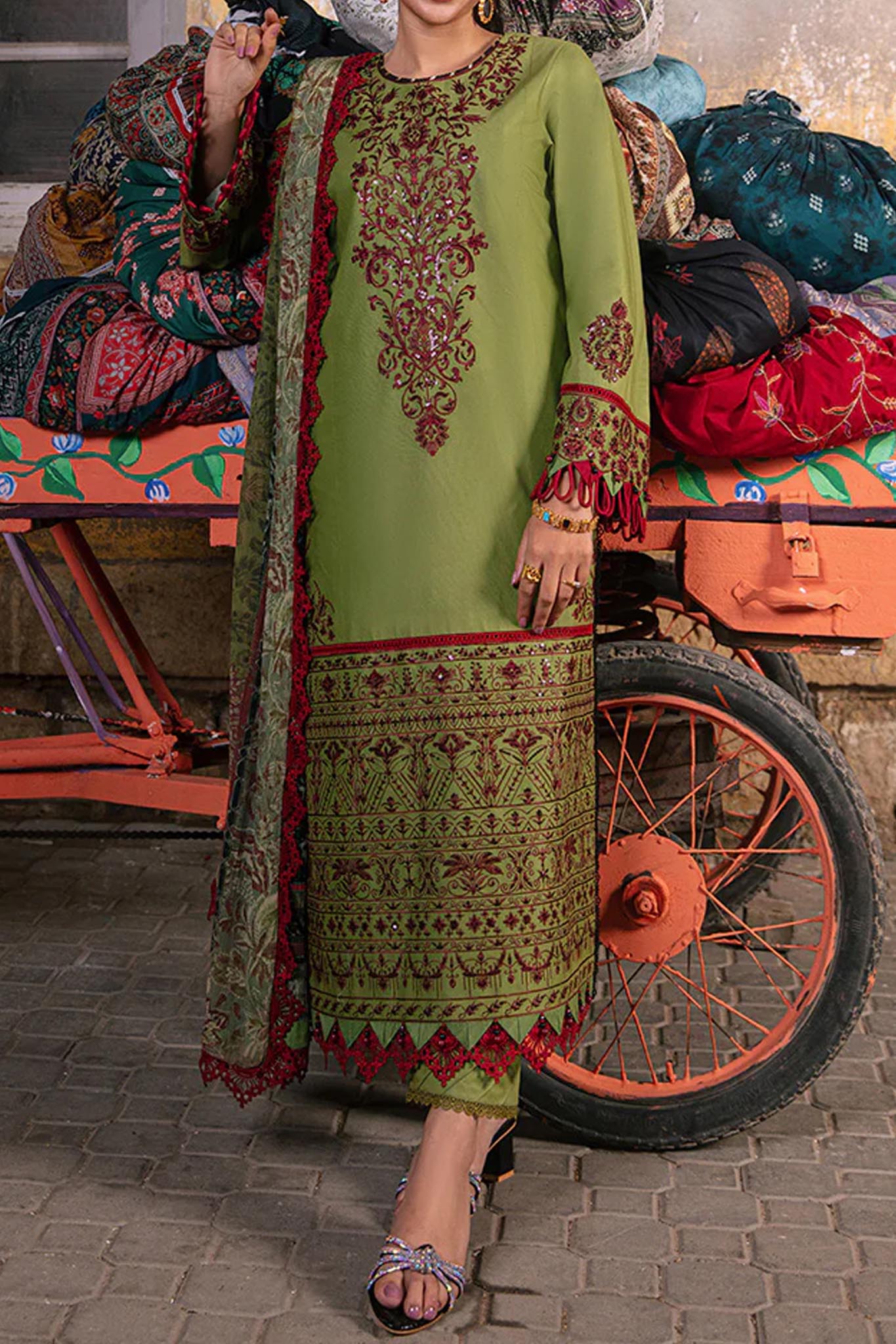 Embroidered center panel on dyed lawn Embroidered front left & right panel on dyed lawn 30" embroidered front daman border...