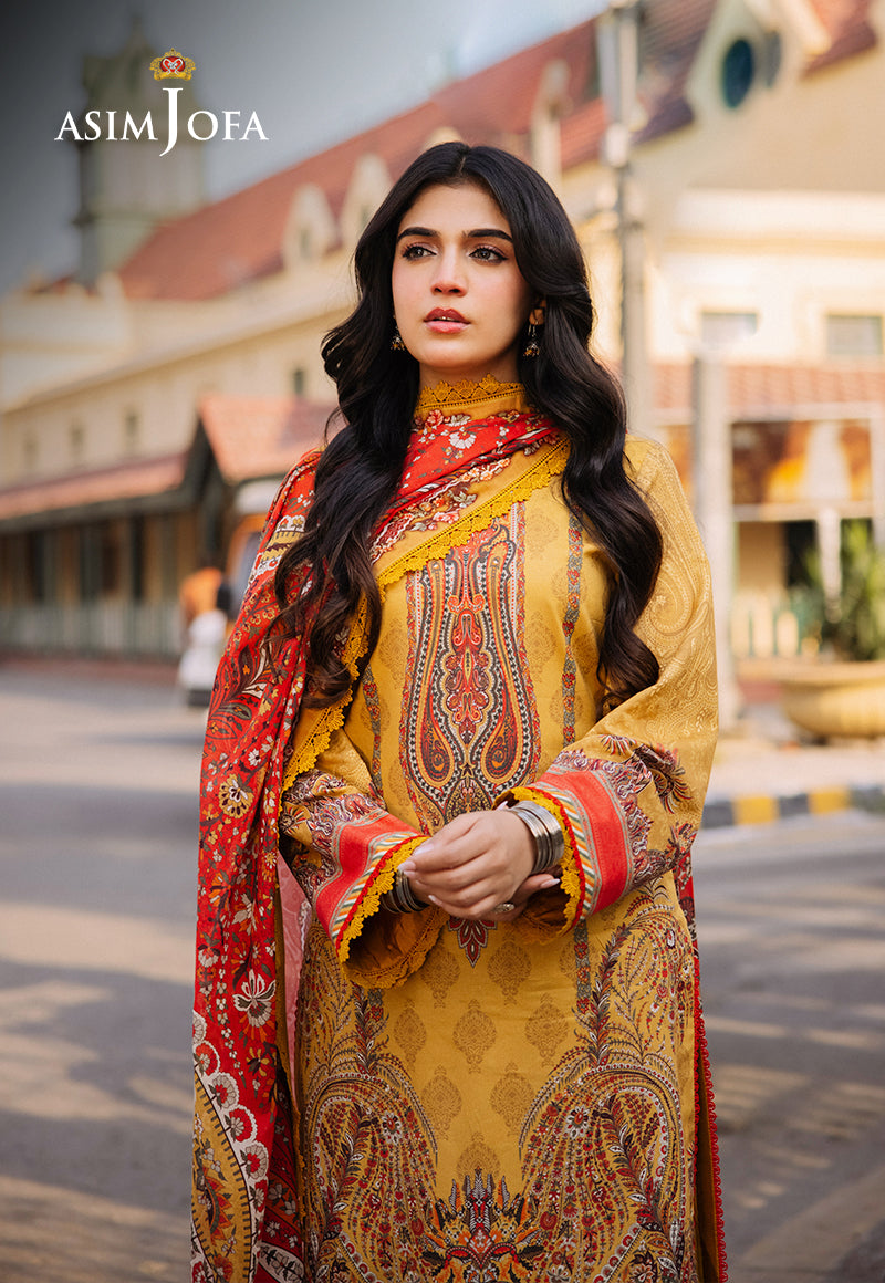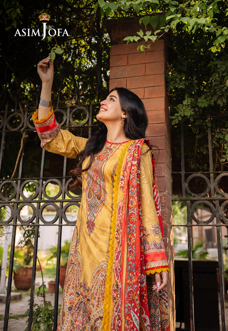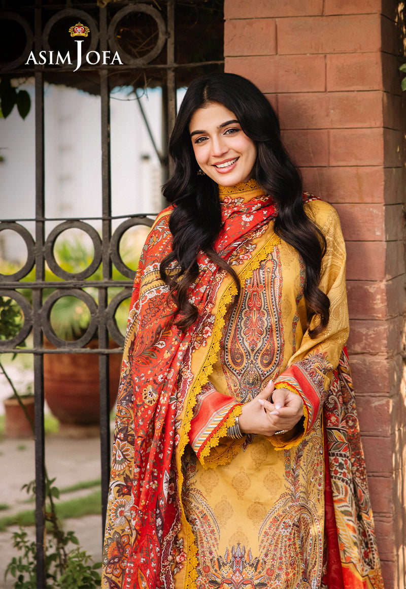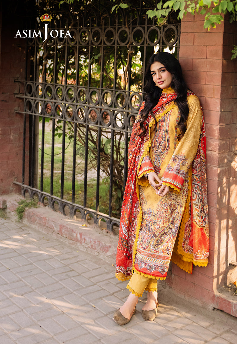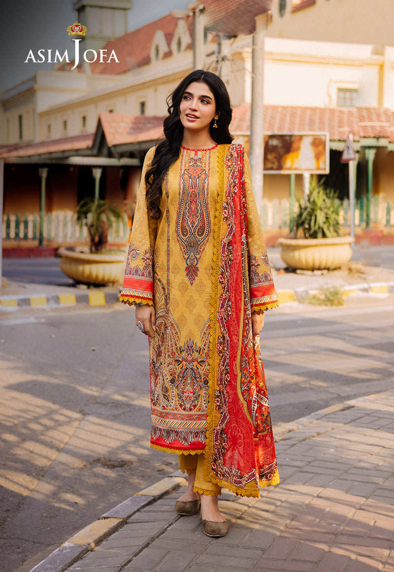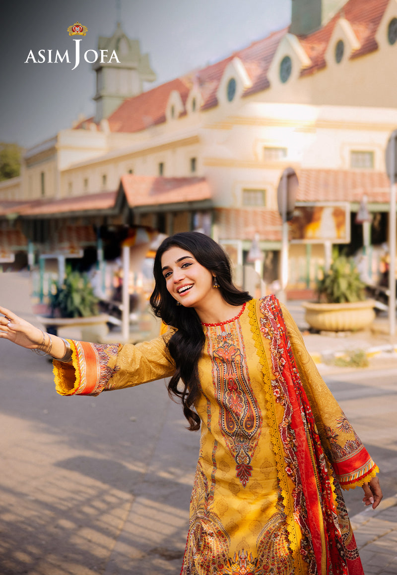 Step into the golden hour with Asim Jofa’s Basic Print Collection. This ensemble is in a yellow hue with orange dupatta is a tribute to the warm sun that bathes bazaars in light. Adorned with polychrome floral and cultural motifs, the lawn shirt is a dance of colors as captivating as the lively carnivals. The dupatta is echoing the same intricate patterns that carries the whispers of old-world charm.