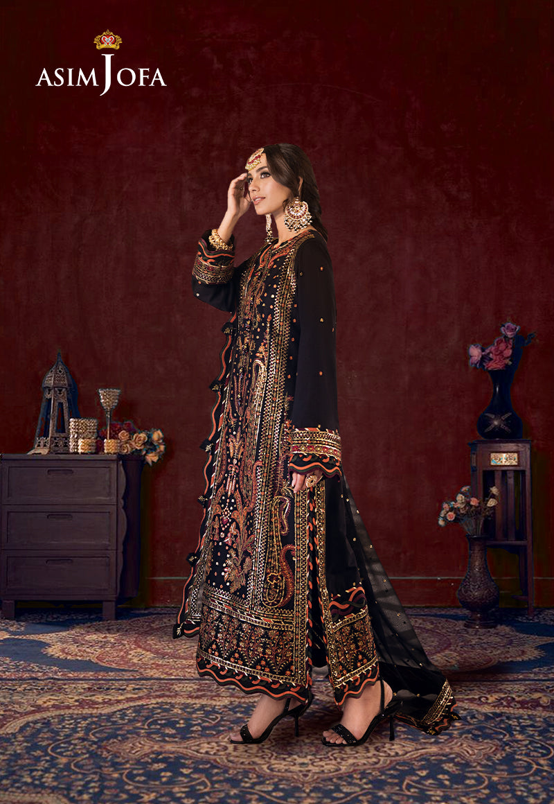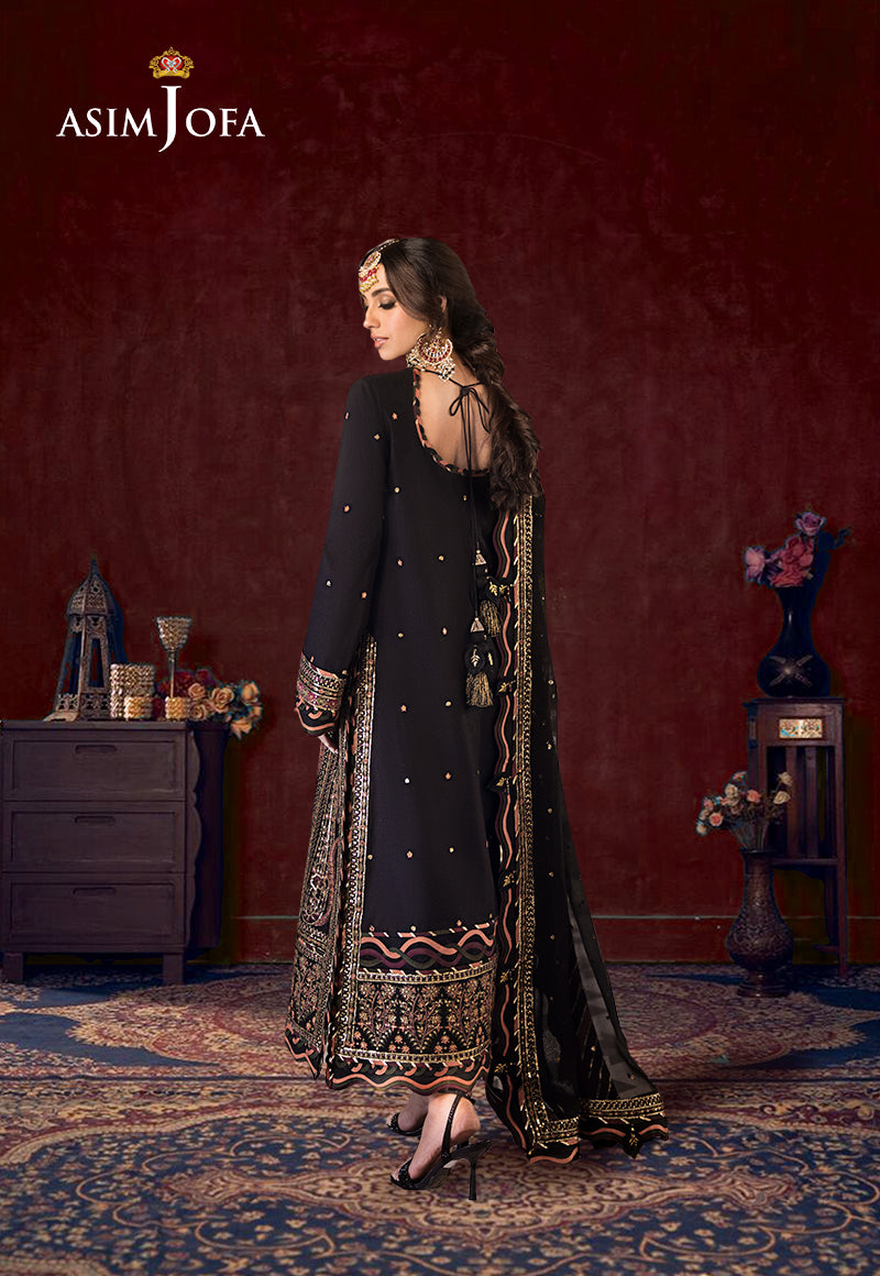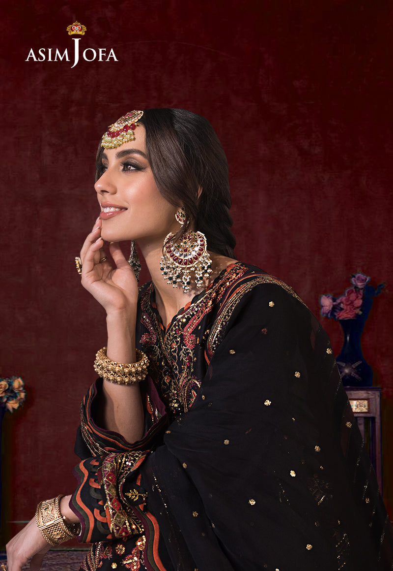 Make a statement with this majestic black outfit adorned with mesmerizing maroon, rust, and dull green threadwork enhanced by the shimmering allure of gold zari and delicate 3mm cupped sequins. The ensemble features an embroidered panels and a back with a border creating a captivating visual symphony. The sleeves and hemline boast their own embroidered borders while the chaak is accentuated with a distinctive embroidered border. The chiffon dupatta adds an ethereal touch with its four-sided border making this outfit a perfect choice for those who appreciate timeless elegance.