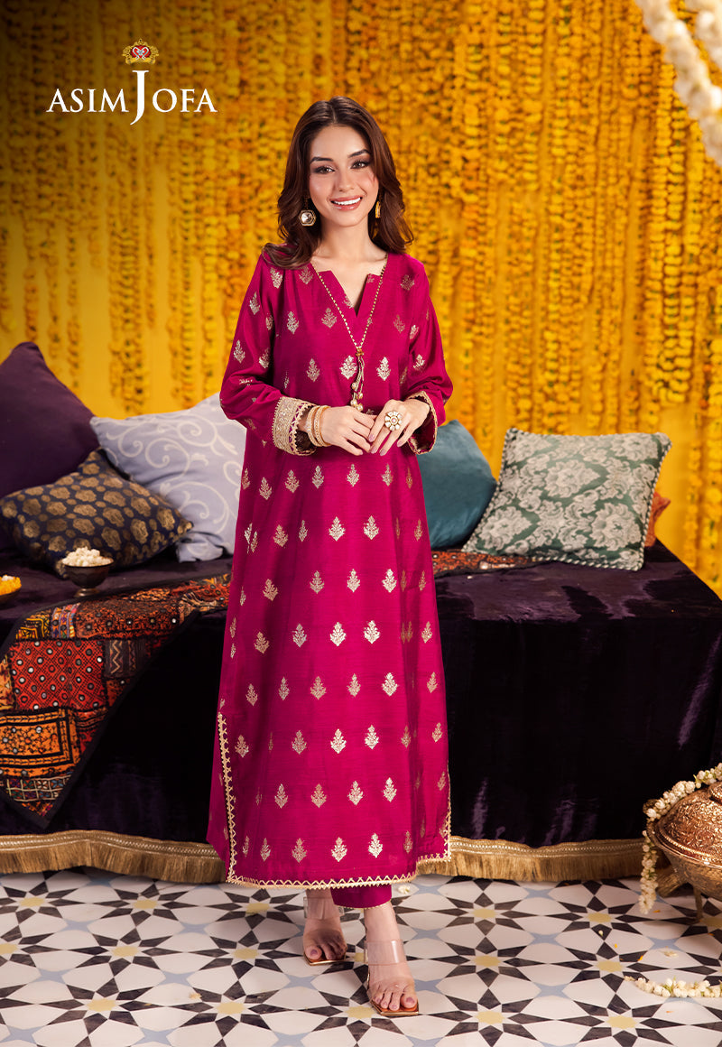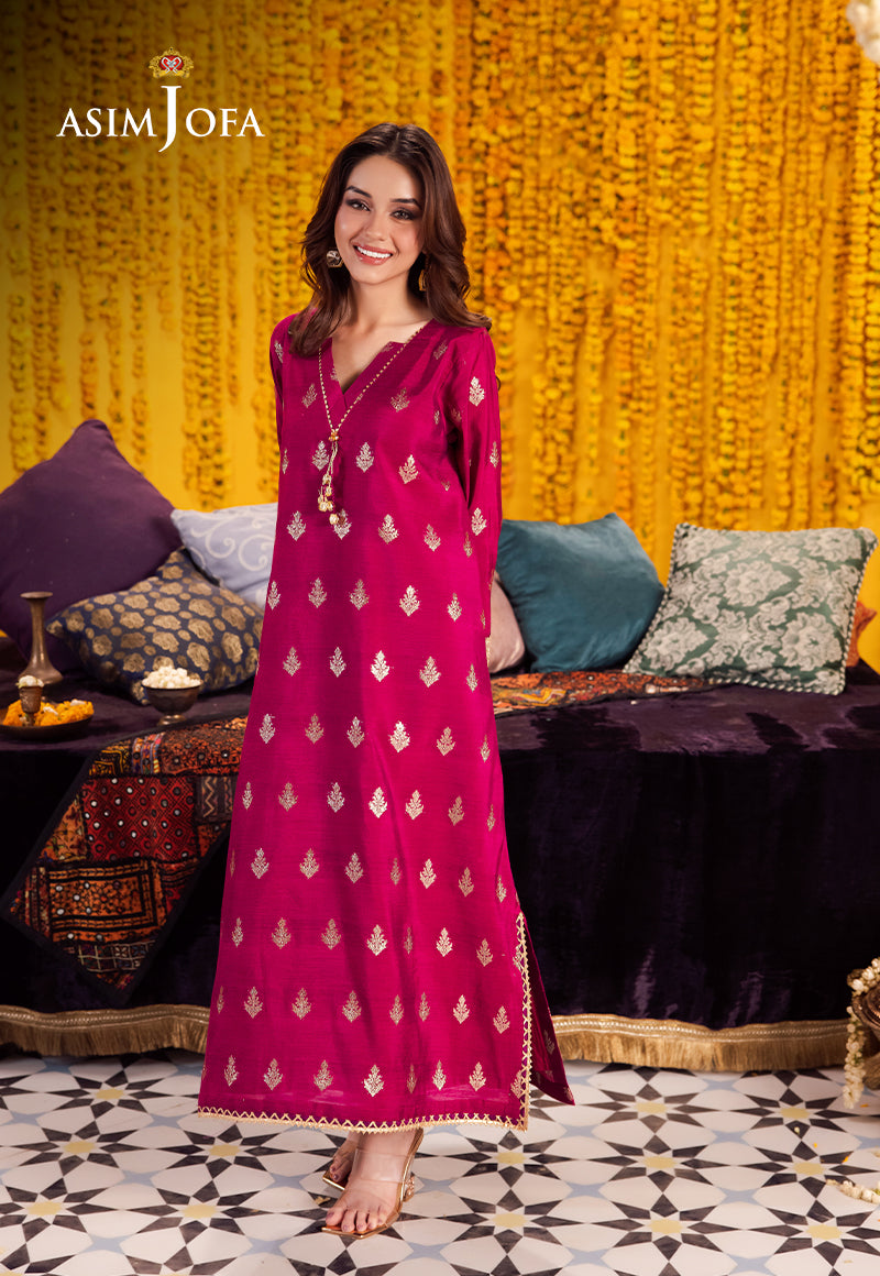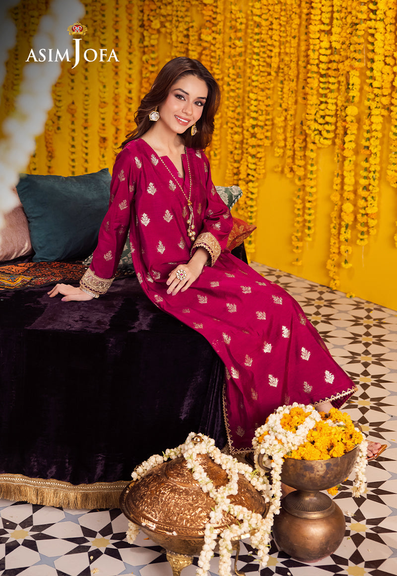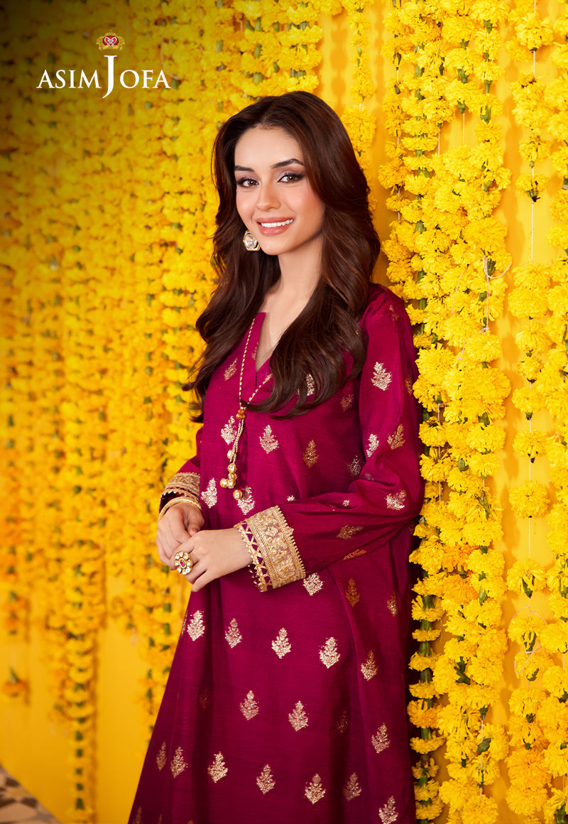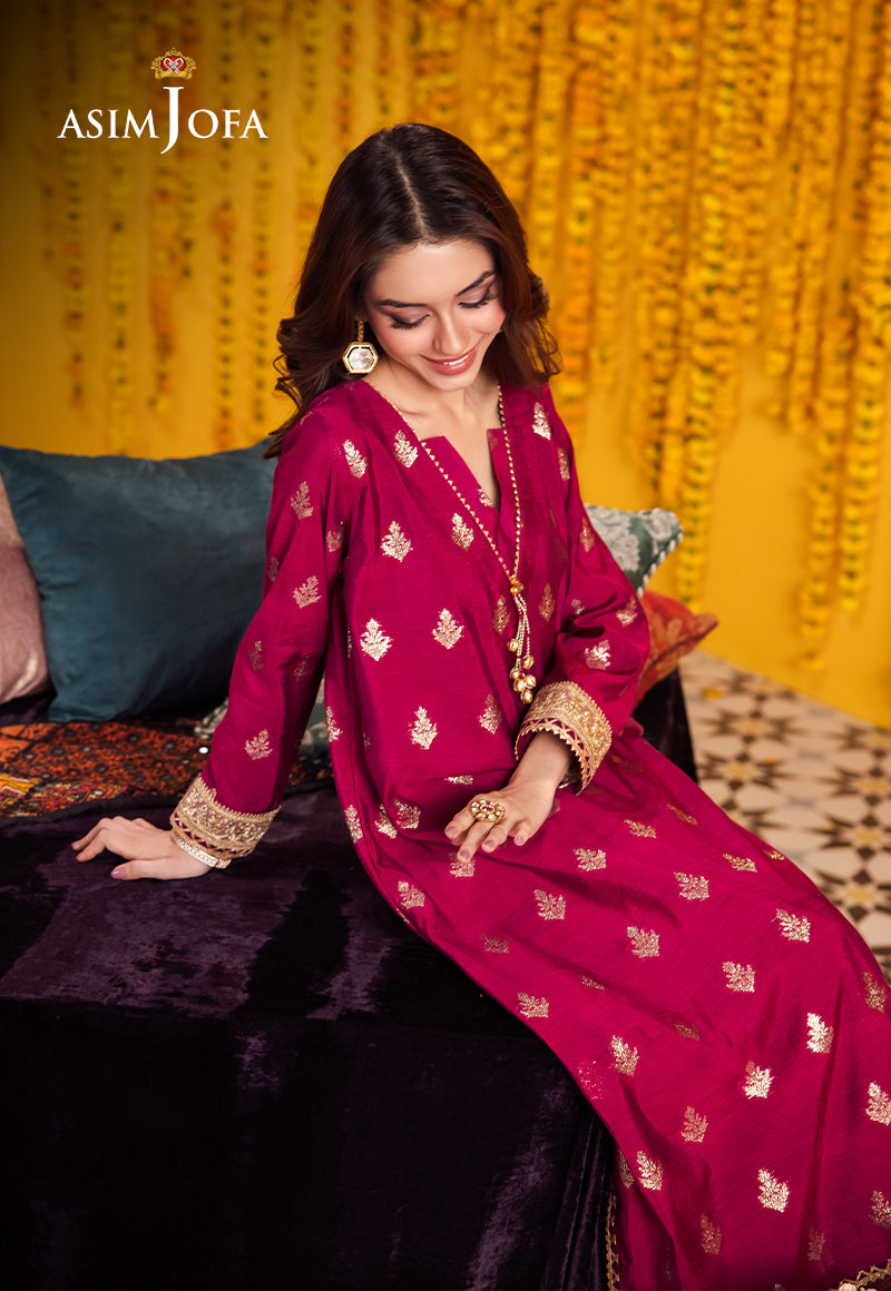 This dress unfurls like a scarlet blossom, the vibrant red hue ignites the room, capturing the essence of joyous celebration. The rich Jacquard fabric, adorned with zari motifs, shimmers like embers dancing in a celebratory bonfire. The shirt is adorned with a V-style neckline with an edge to give it a vibrant energy and style.