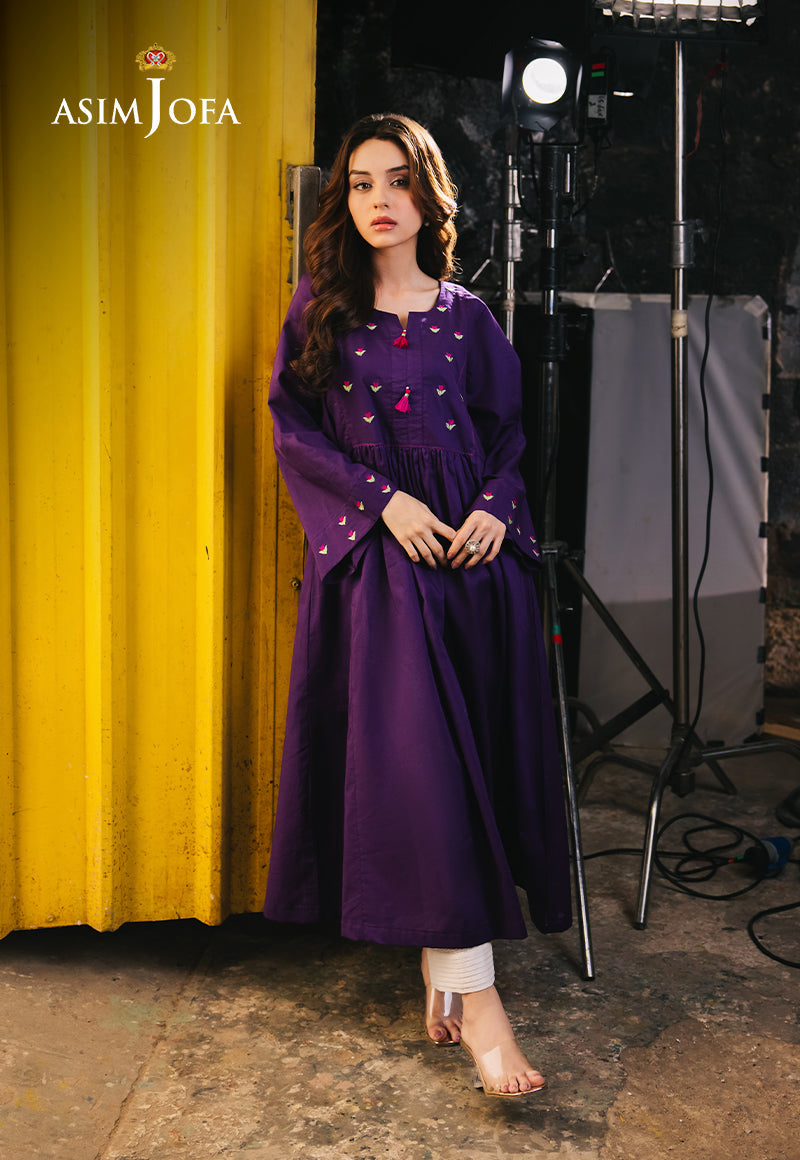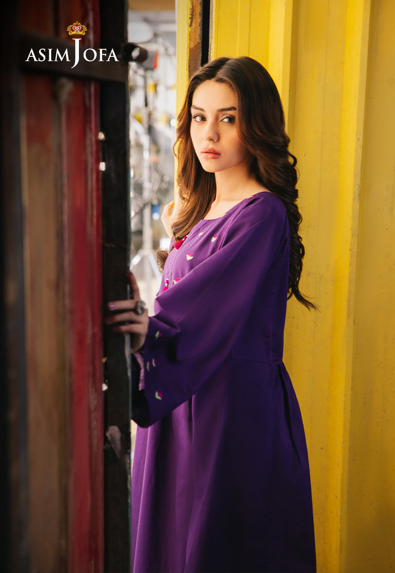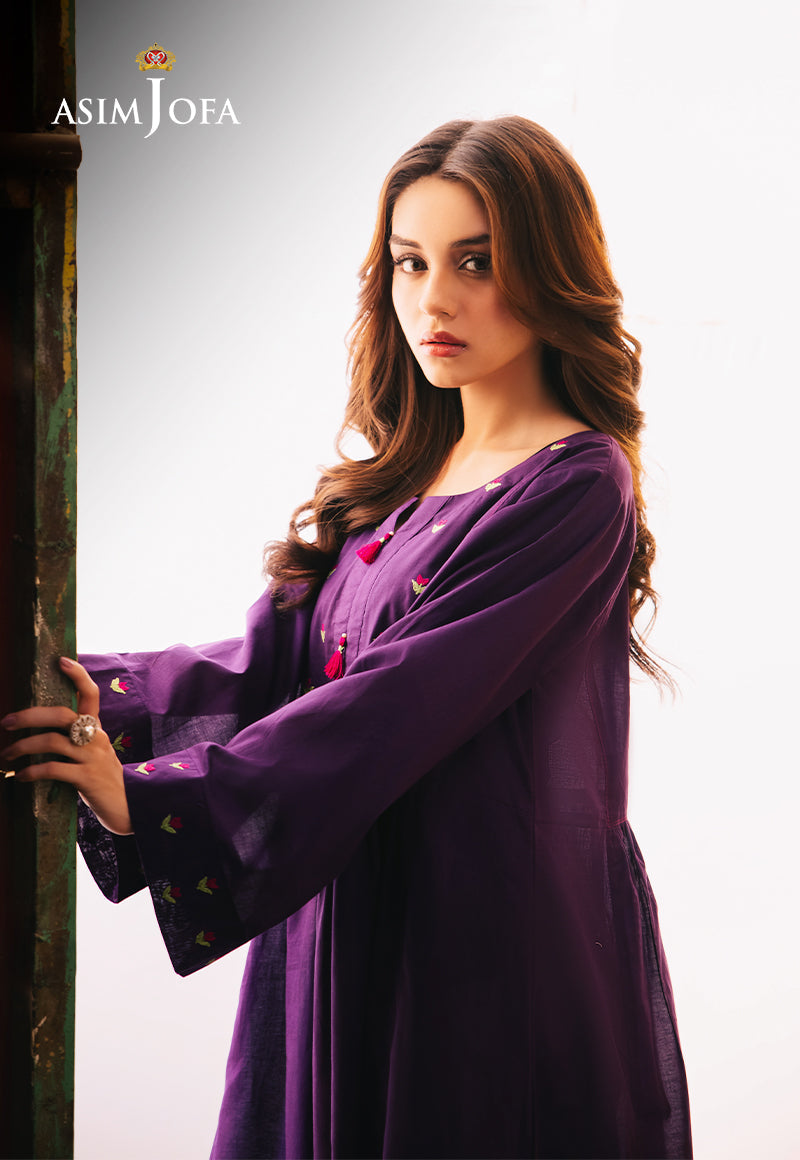 Be your gorgeous self in this purple dress. The tailored silhouette enhances your aura, and the rich color commands attention. Minimalistic floral embroidery on the neckline and sleeves gives it a whimsical look. Paired with white trousers for a contrasting edge, making this a versatile choice for any special occasion.