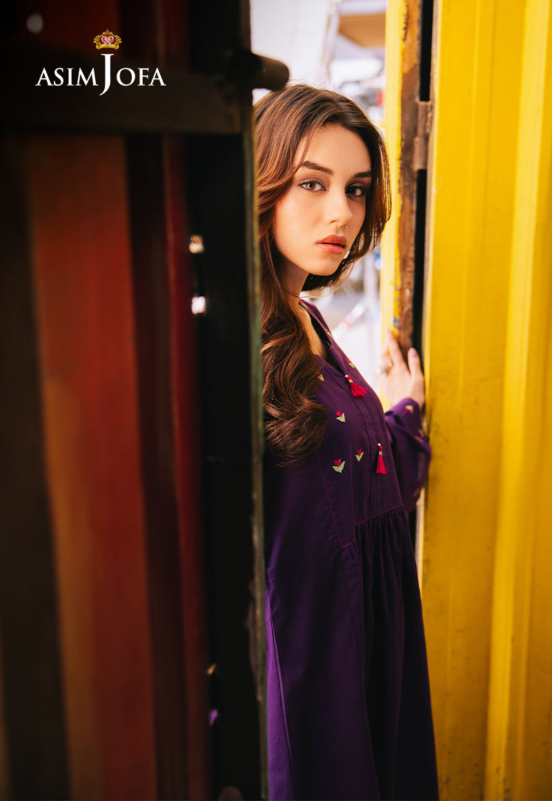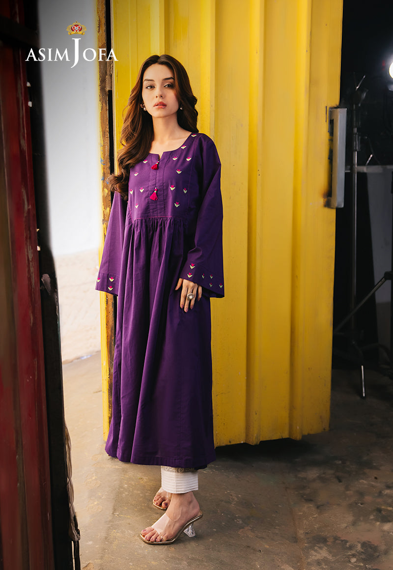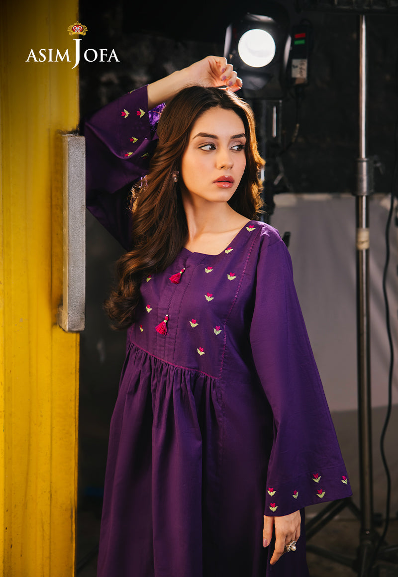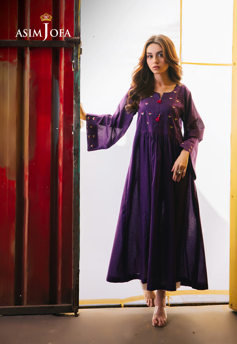 Be your gorgeous self in this purple dress. The tailored silhouette enhances your aura, and the rich color commands attention. Minimalistic floral embroidery on the neckline and sleeves gives it a whimsical look. Paired with white trousers for a contrasting edge, making this a versatile choice for any special occasion.