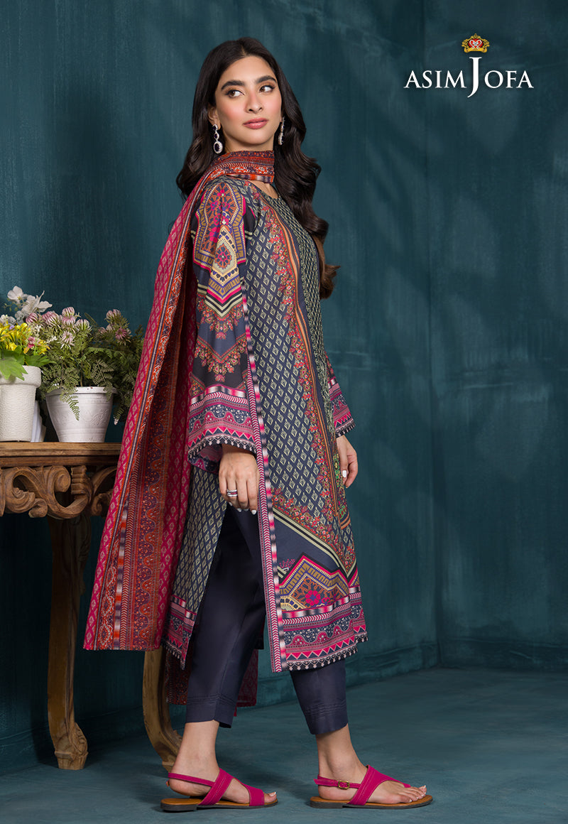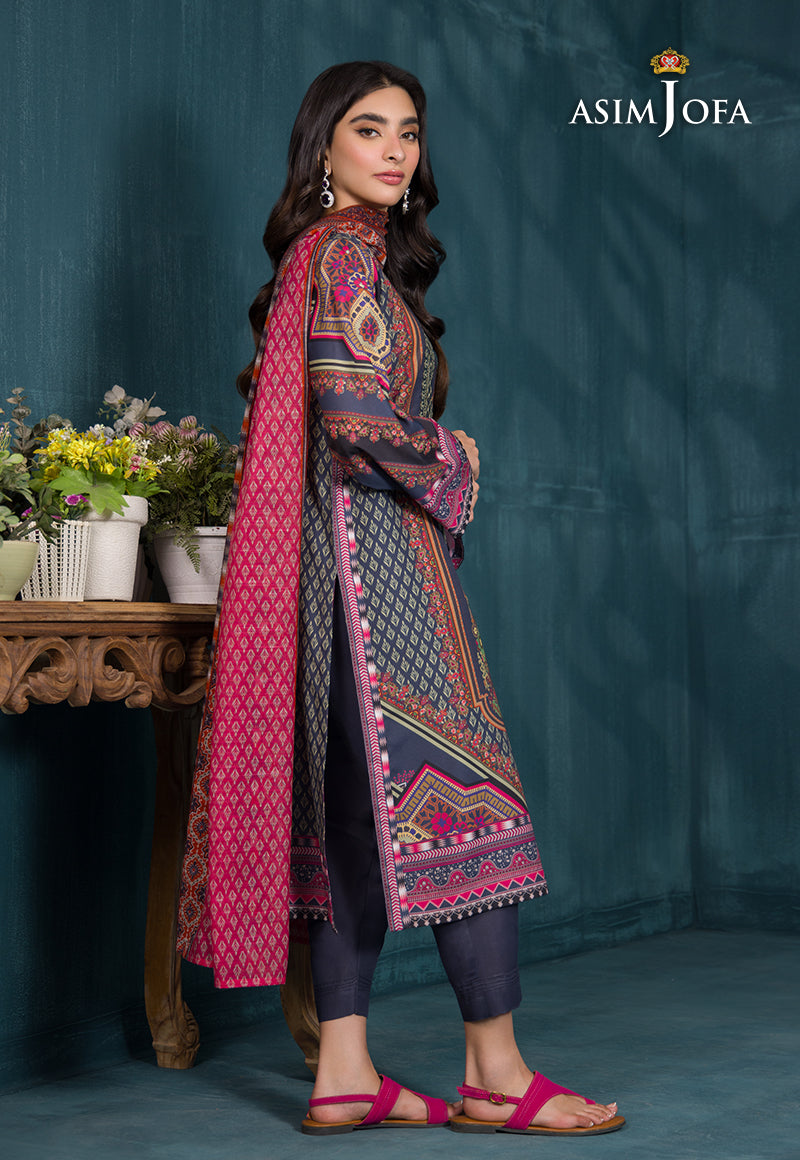 Elegance in midnight blue: a 3-piece set with contemporary motifs on the shirt, bright pink borders on the Indian lawn dupatta, and solid trousers.
