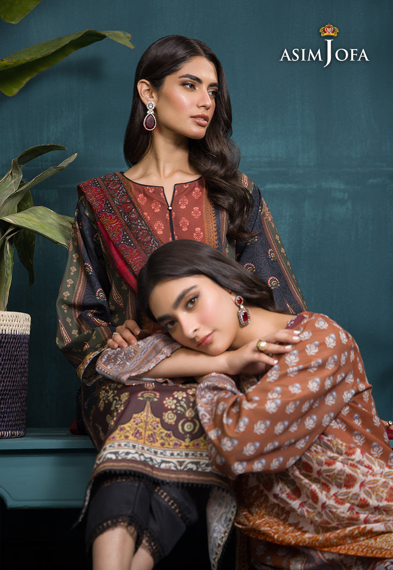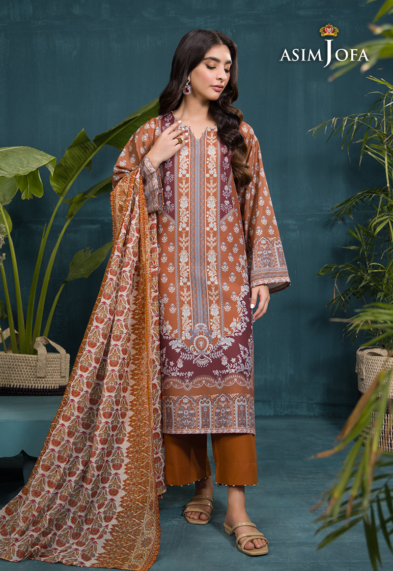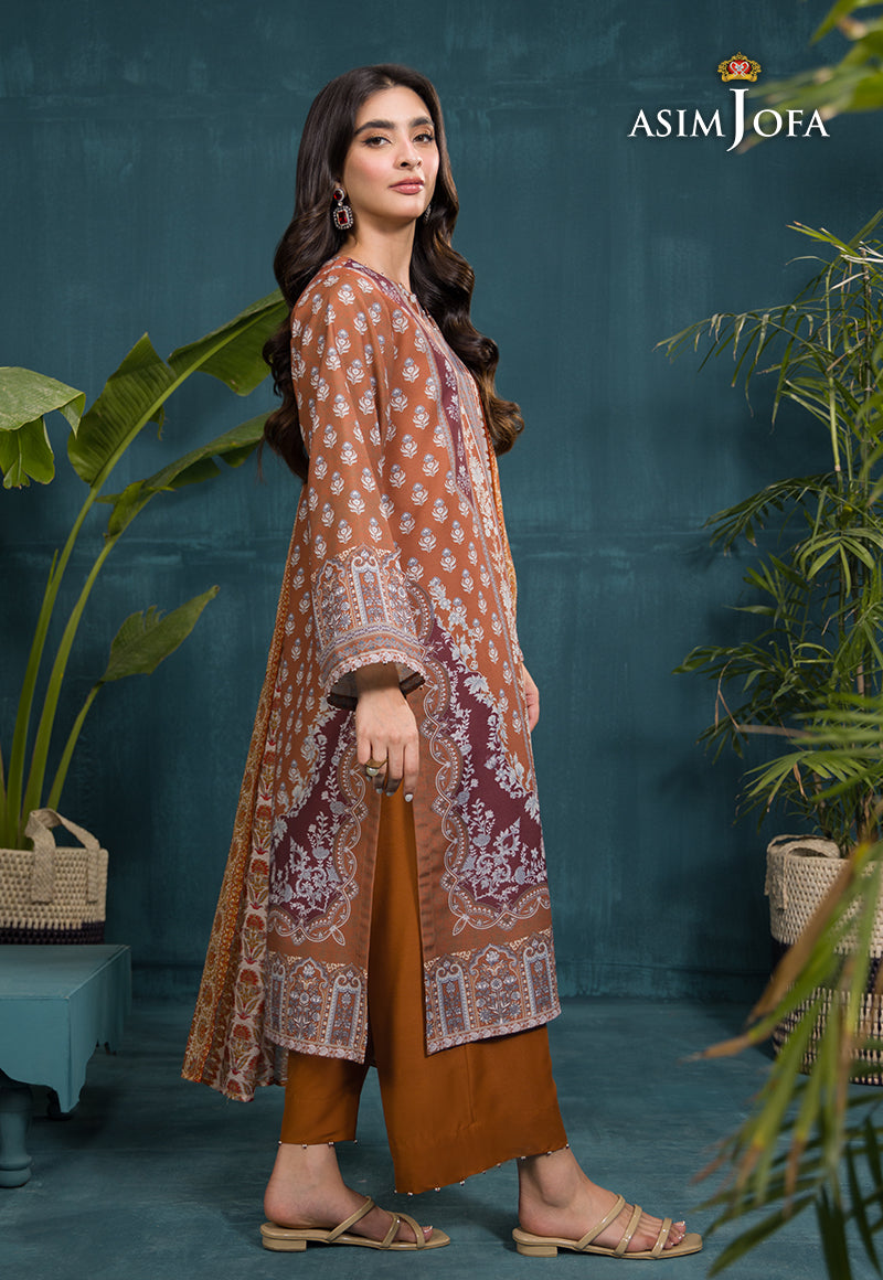 Experience artful fusion in this ensemble that includes a sepia brown shirt with a mesmerizing damask pattern, Indian Lawn dupatta, and trousers.