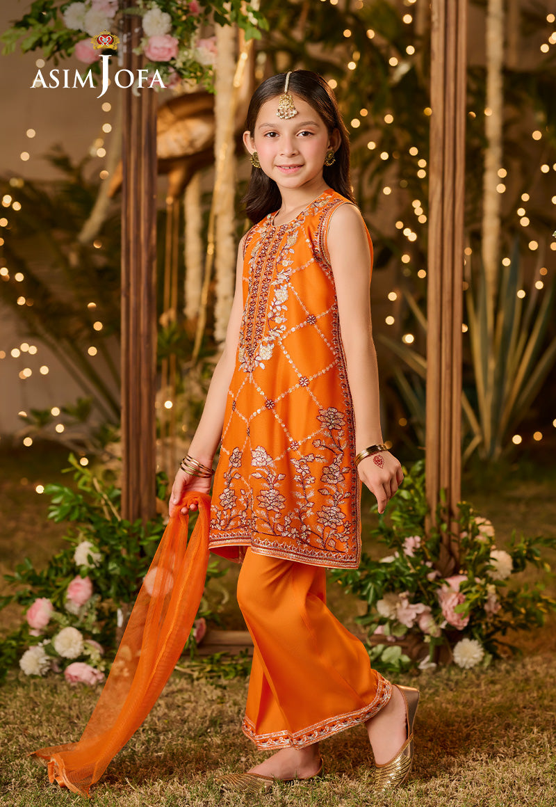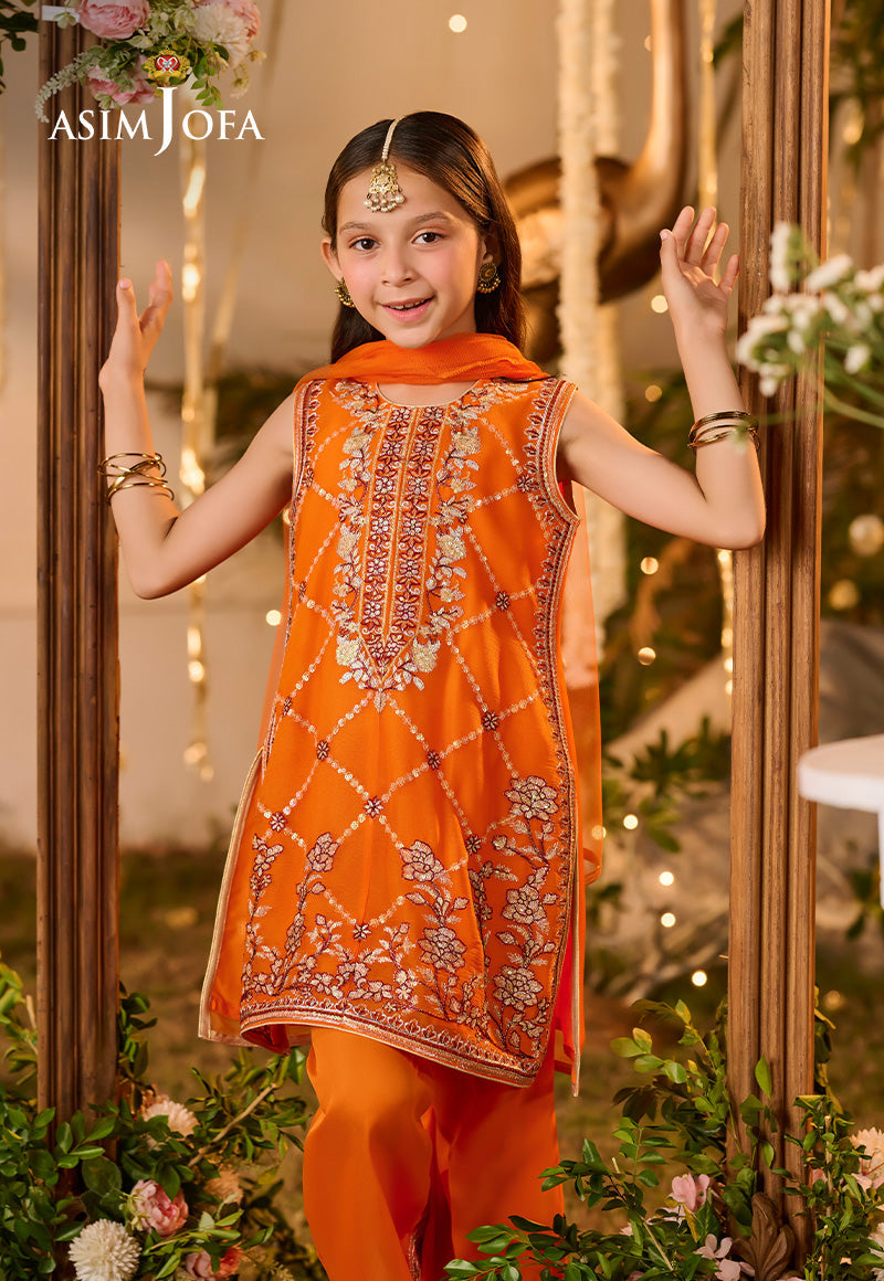 This sunny and cheerful orange ensemble, bursting with vibrant embroidery, is like a ray of sunshine. Its warm, inviting color will make your child feel full of energy and happiness. The matching trousers with embroidered border and flowing dupatta complete the look, perfect for a lively mehndi event. Envision your kid as the life of the party in this stunning outfit.