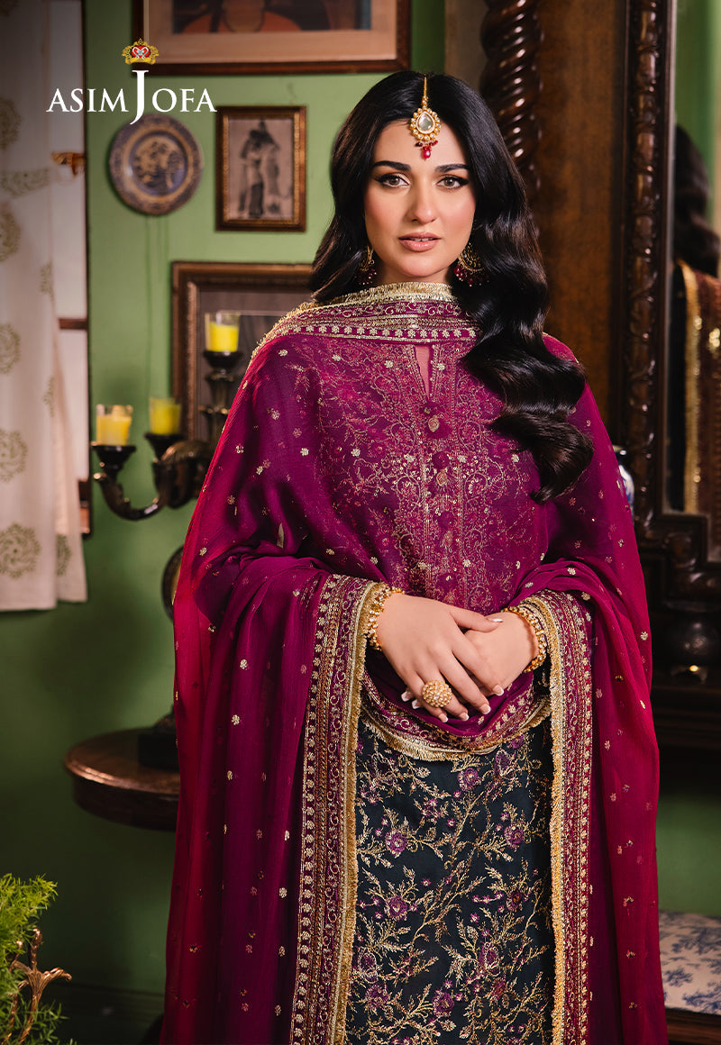 Step into a secret garden with this verdant ensemble, a whisper of captivating stories. The green shirt shimmers with a subtle sheen of gold sequins, its surface adorned with a delicate tapestry of floral embroidery crafted in antique gold, dual-toned zari and magenta thread, showcasing the meticulous artistry. The neckline, a breathtaking display of grace, redefines elegance. A wispy chiffon dupatta, in striking contrast with its rich maroon hue, echoes the collection's luxurious narrative. This exquisite combination creates a perfect outfit for a soiree.