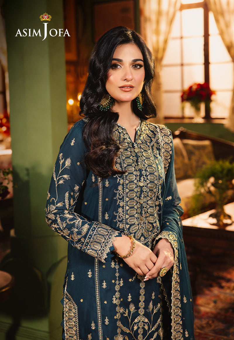 Unveil the mysteries of the deep sea with this enchanting teal ensemble. The shimmering teal shirt, reminiscent of the ocean's depths, is gorgeously embroidered with gold zari and beige threads in a shiny presence of gold cupped sequins, depicting the glint of a tropical sea’s sun-kissed crest. The translucent dupatta, serenely embroidered, completes the ethereal look, perfect for making a splash on any occasion.
