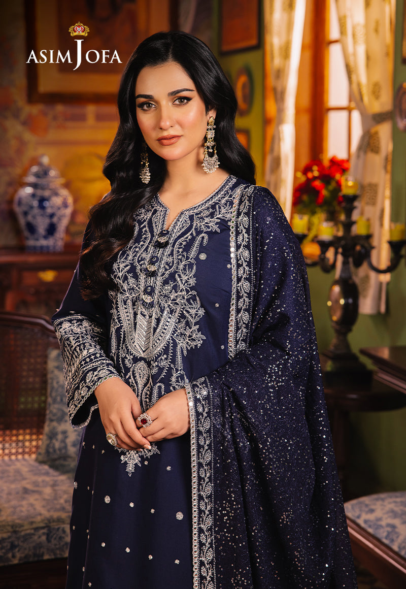 Embrace the mystery of a starlit indigo night with this flawless ensemble. The navy-blue shirt boasts a stunning neckline and border, meticulously embroidered in shimmering silver zari. Scattered cupped sequins twinkle like a celestial display, mimicking the star-dusted night sky. The paired dupatta, adorned with a swirling, calligraphic design and accented with a touch of sequins, completes the look with an air of refined elegance.
