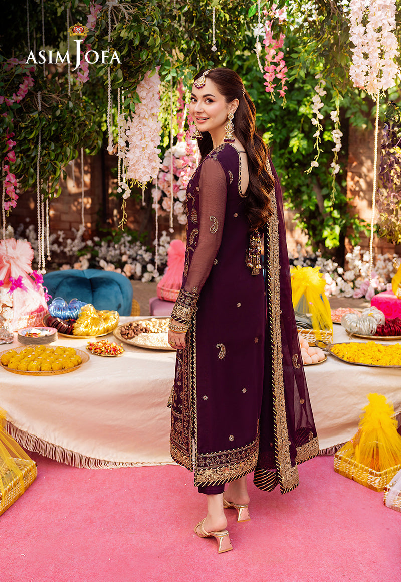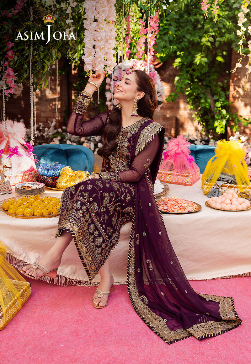 Asim Jofa invites you to bask in the glow of this gem from the sparkling Jag Mag Collection. Cloaked in a deep purple hue, this ensemble is intricately decked with gold zariwork and delicate 3mm sequins reflecting the festive spirit of celebration. The embroidery all-over shirt with its borders exudes a jovial vibe while the embroidered dupatta adds a layer of sophistication. Experience the luminous outfits of the Jag Mag Collection and stand out with a glamour that twinkles like the vibrant hues of dusk.