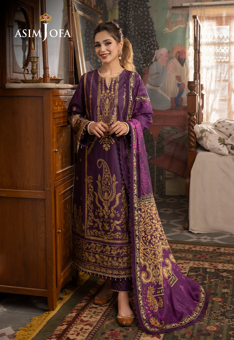 Immerse yourself in a royal symphony of elegance with this purple ensemble where every stitch creates a melodic narrative. The embroidered panels a regal overture are adorned with beige threadwork and sequins reminiscent of musical notes that dance in harmony. The embroidered sleeves with delicate borders become the rhythmic undertones adding a touch of grace to the ensemble. The trouser grounds the outfit in understated sophistication. Paired with a lawn dupatta, the ensemble becomes a symphony of colors and motifs, creating a visual masterpiece that resonates with regal allure.
