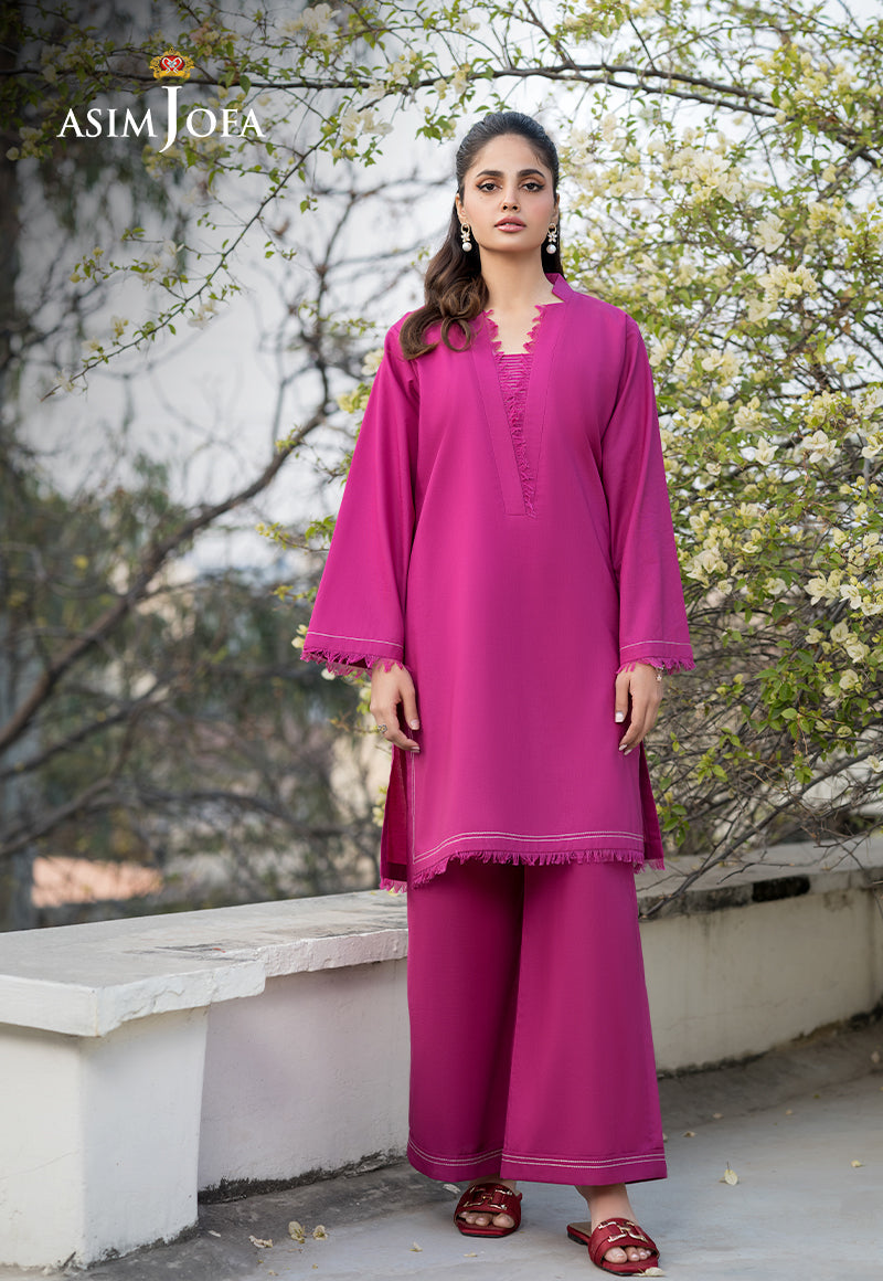Make a bold statement with this vibrant magenta ensemble. The solid shirt exudes timeless elegance with its clean, minimalist design, while the matching trousers add a touch of effortless sophistication. Perfect for any occasion, this outfit combines striking color with understated style.