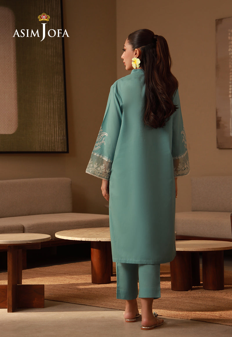This sea green ensemble is minimalism redefined. The shirt, with its crisp collar neckline and subtle button accents on the front, exudes a sense of understated sophistication. However, the true focal point lies in the sleeves, where stunning embroidery takes center stage, adding a touch of artistic flair. Paired with plain trousers, the outfit exudes modernity.