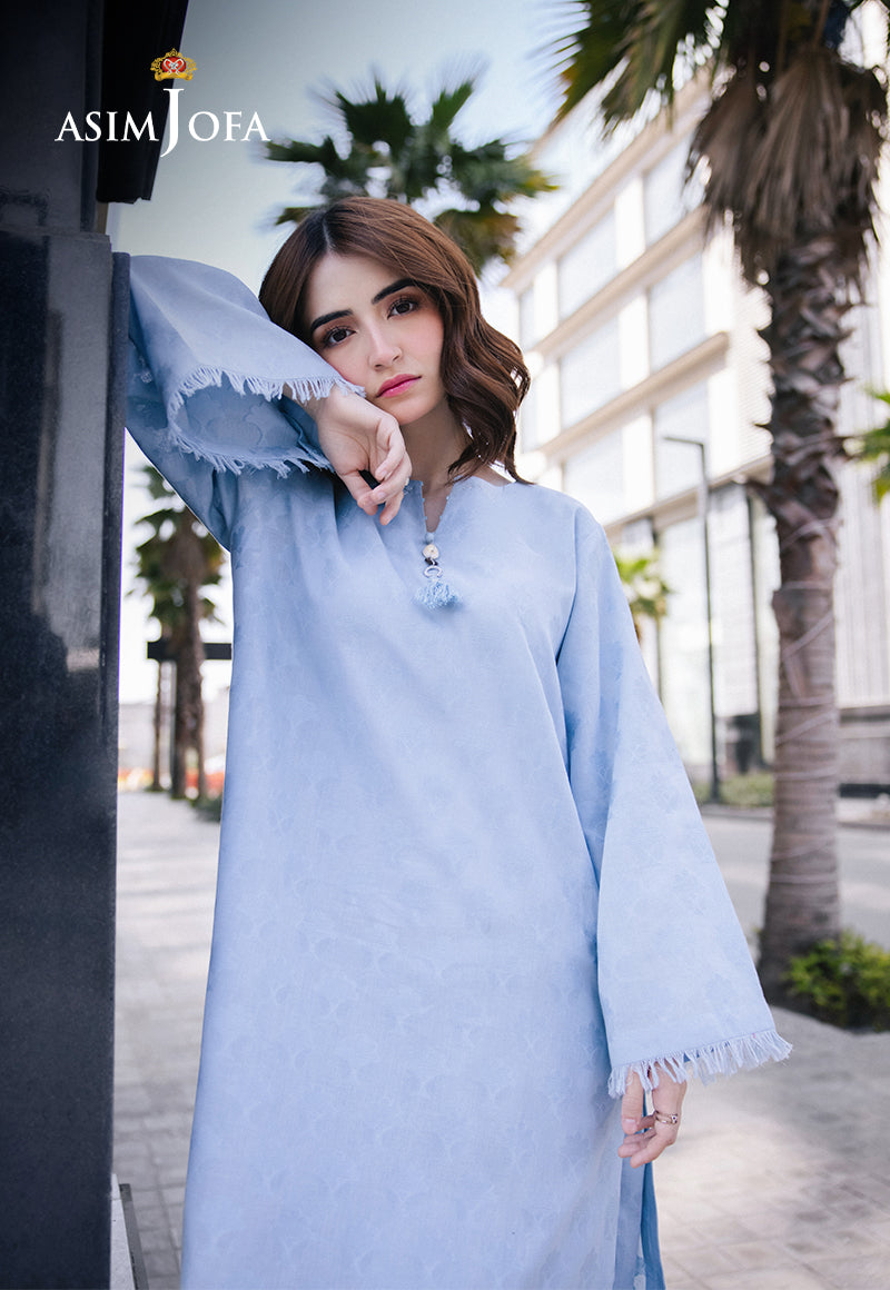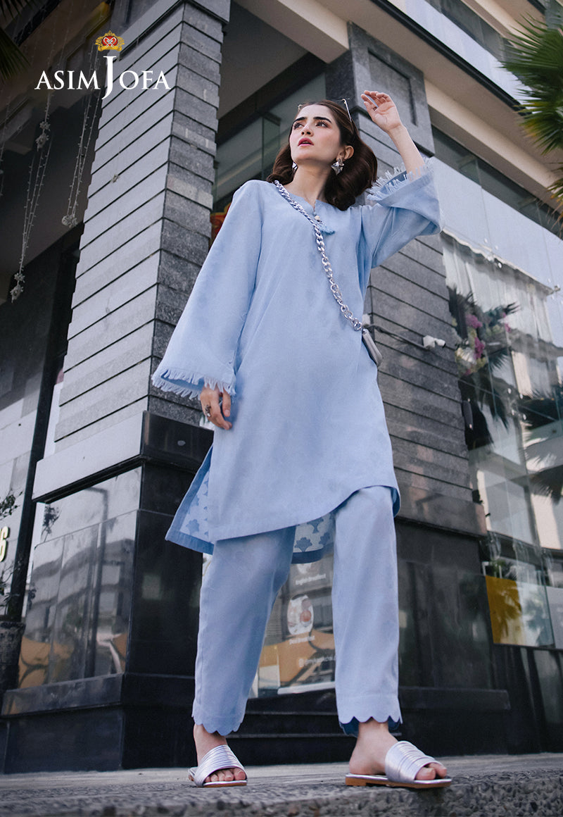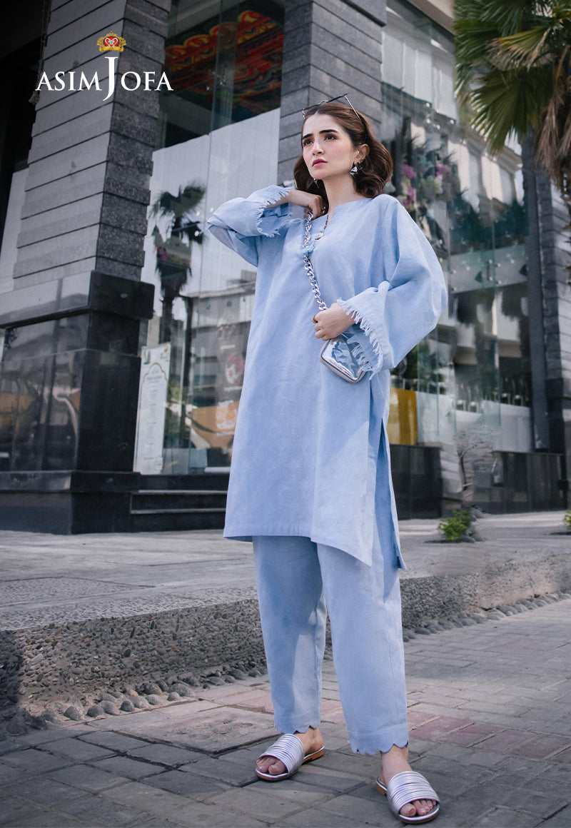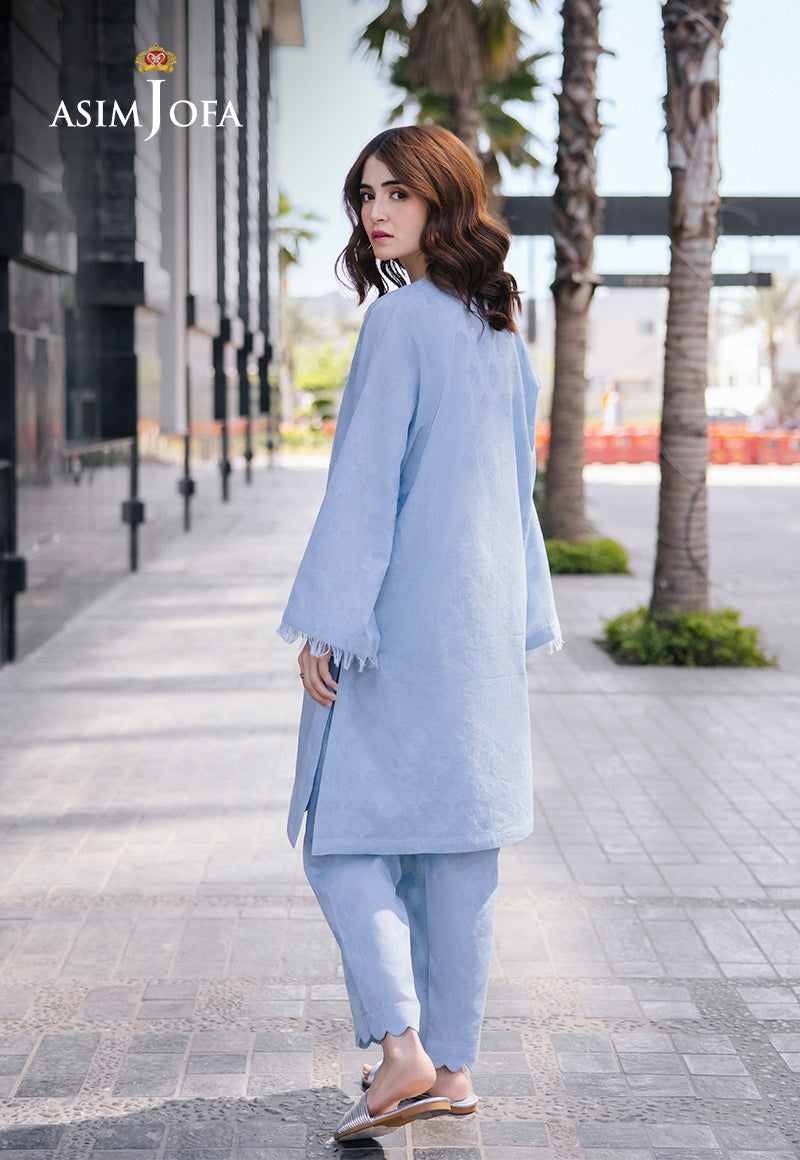 The light blue self-jacquard coord is all about easy-breezy vibes with its relaxed and comfy full-length sleeves with fringe details. Matched perfectly with straight-fit scallop trouser, this set is all about effortless coordination and understated charm.