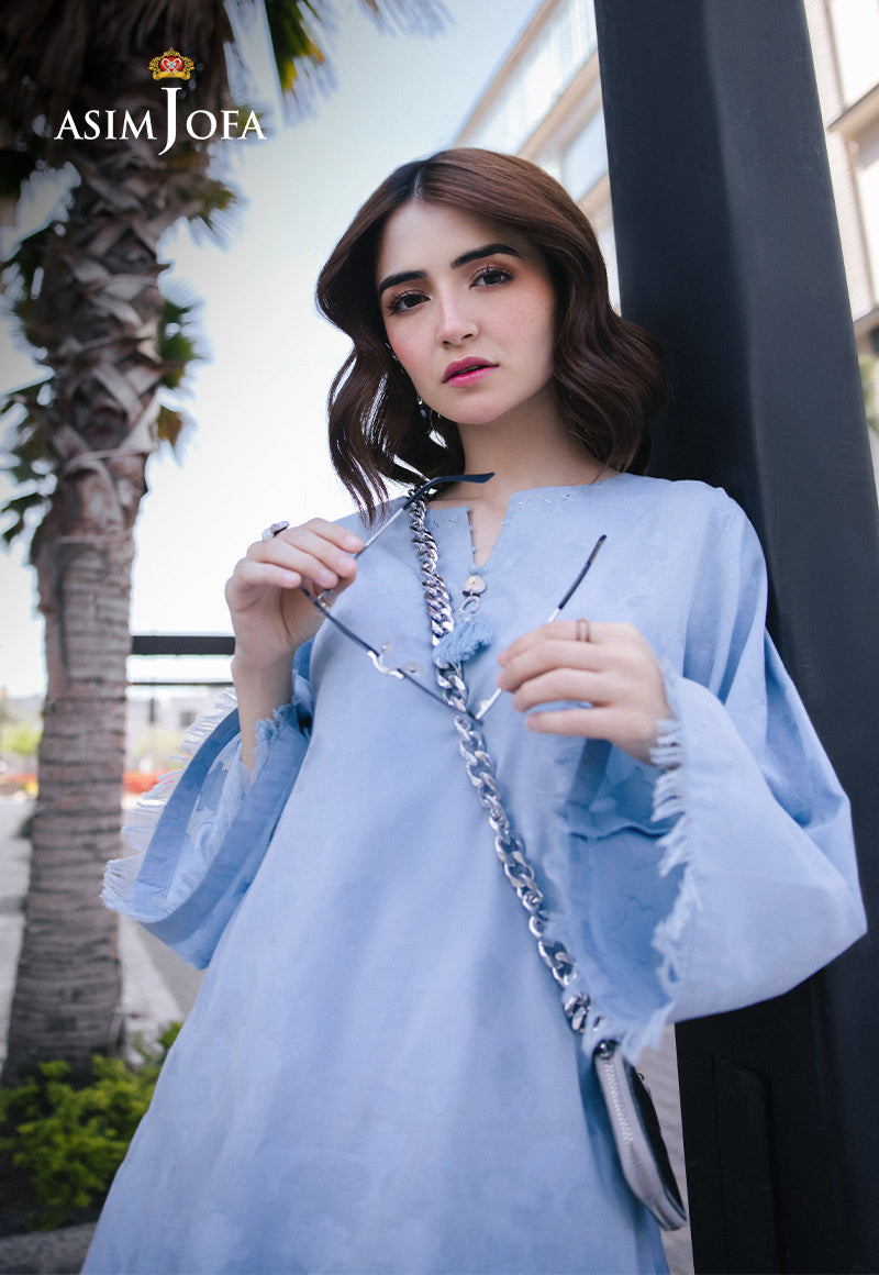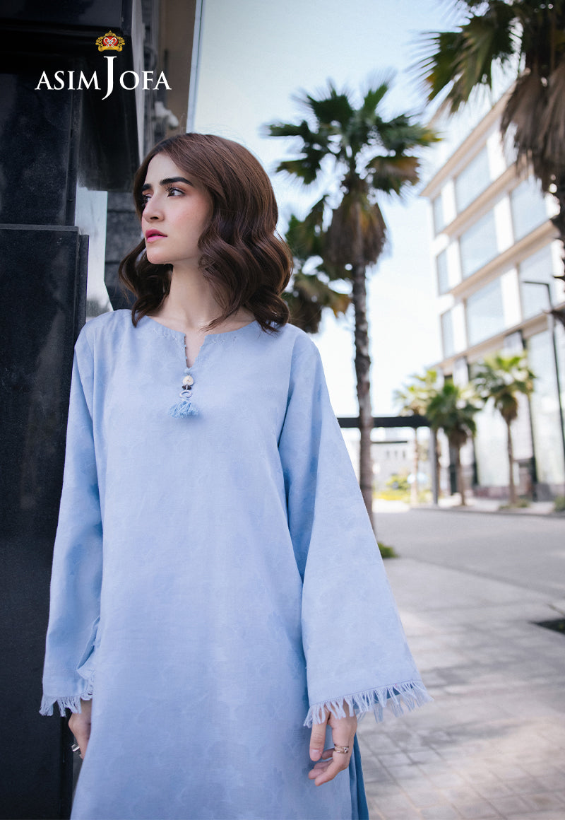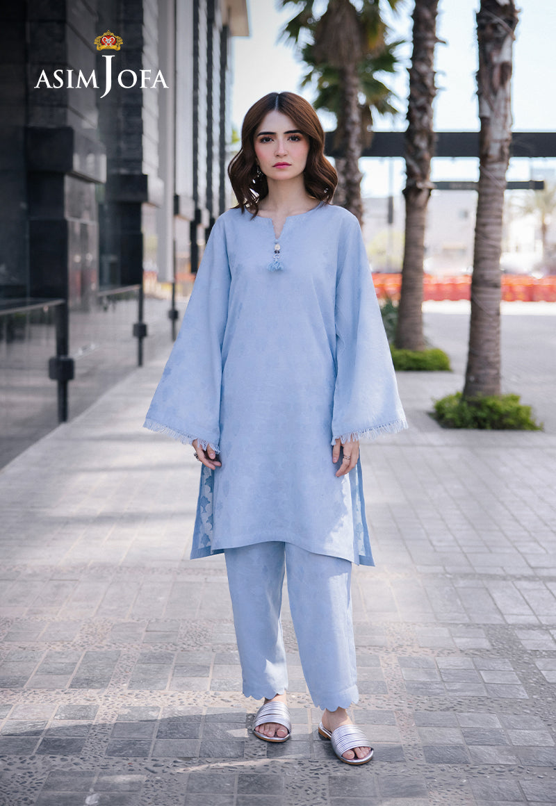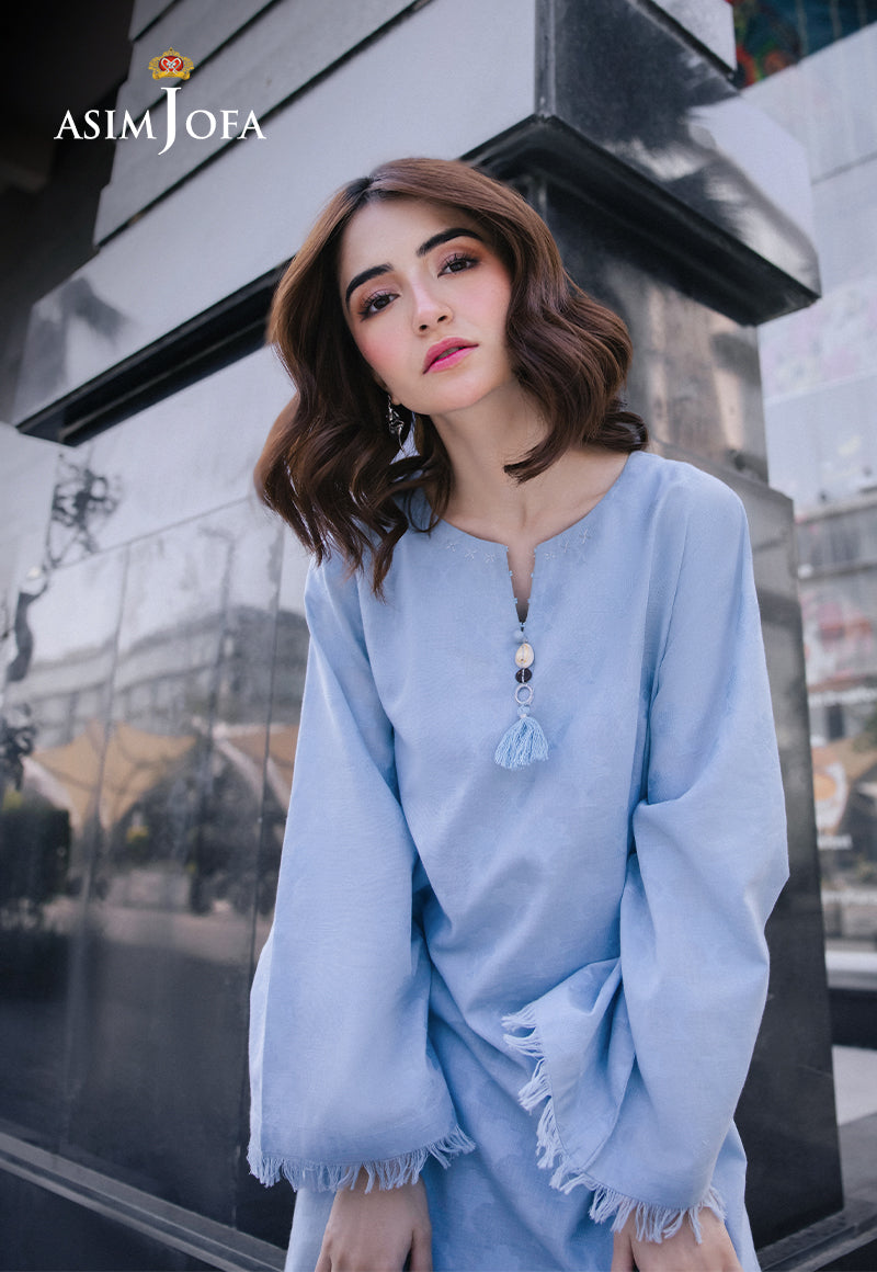 The light blue self-jacquard coord is all about easy-breezy vibes with its relaxed and comfy full-length sleeves with fringe details. Matched perfectly with straight-fit scallop trouser, this set is all about effortless coordination and understated charm.