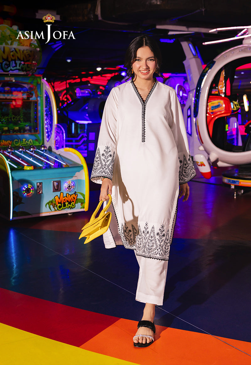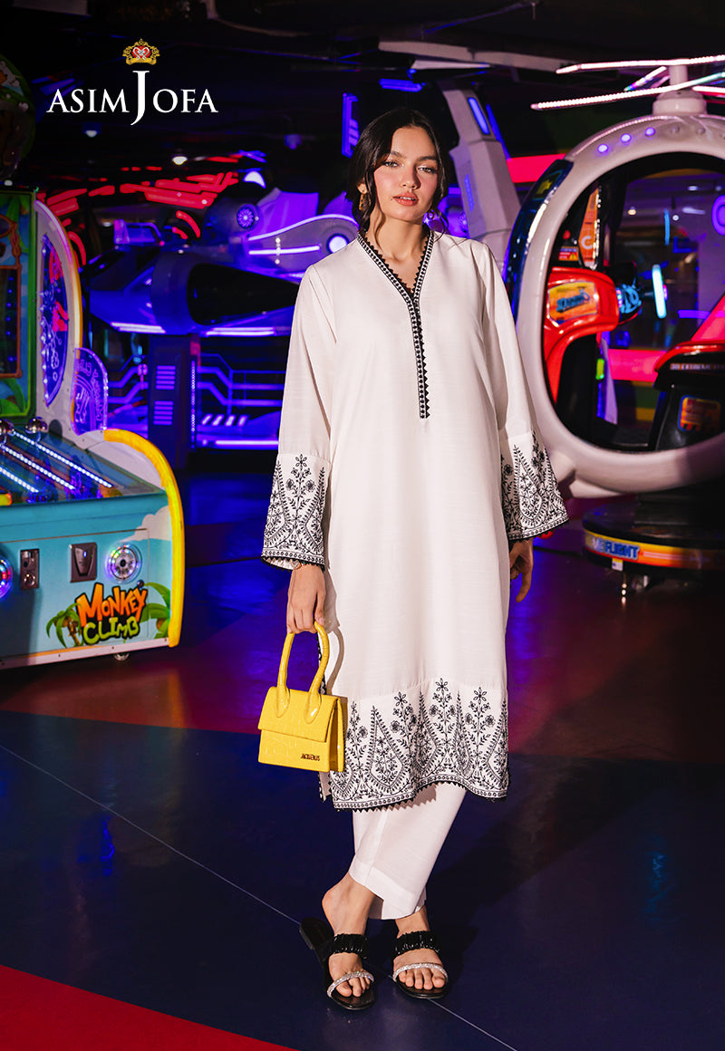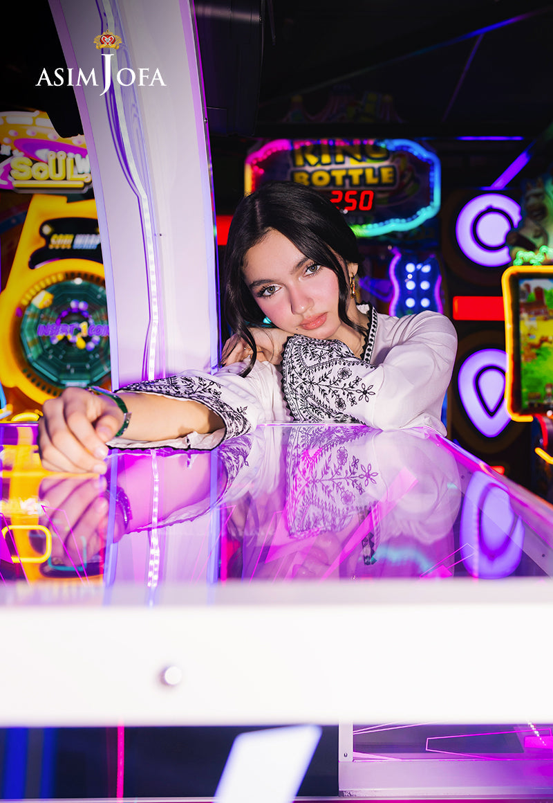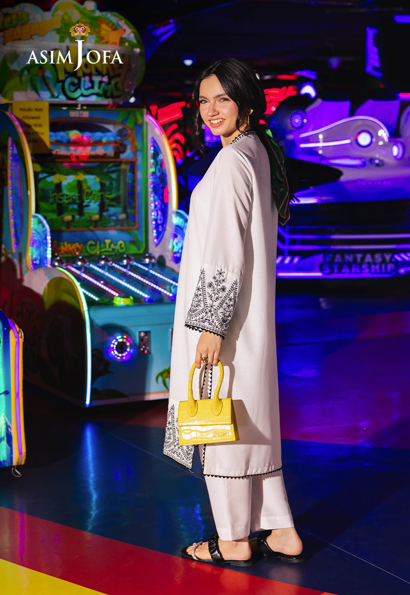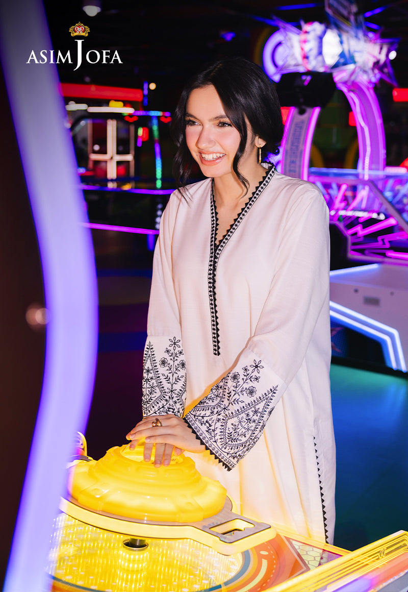 Effortlessly chic, this off-white ensemble is a wardrobe winner. The elegant neckline is complemented by black embroidery that graces the borders and sleeves, adding a touch of drama. Versatile enough for any occasion, this dress transitions seamlessly from formal to casual.