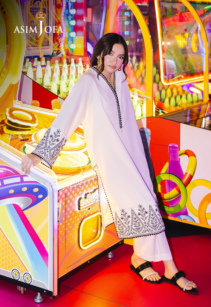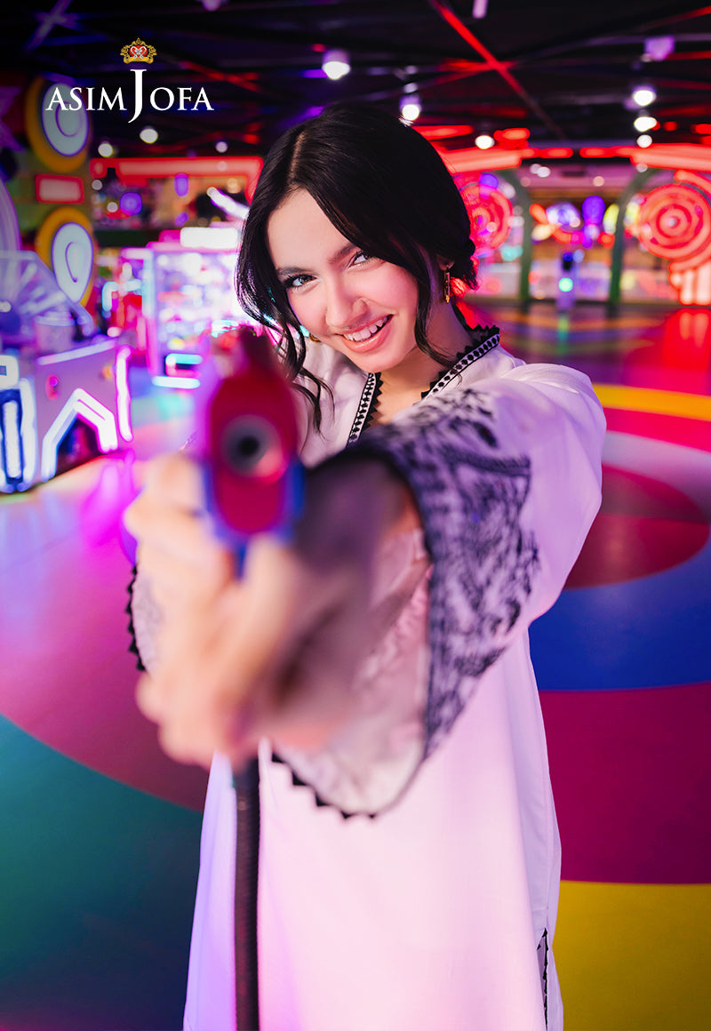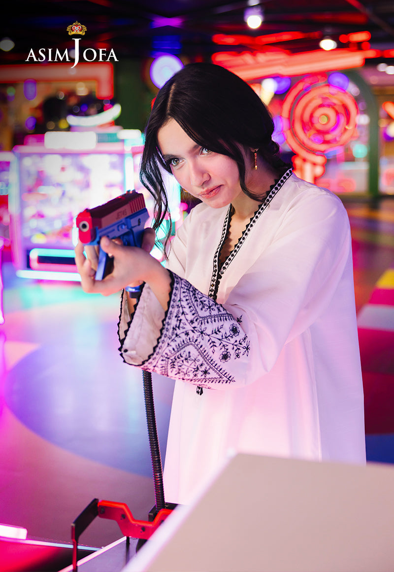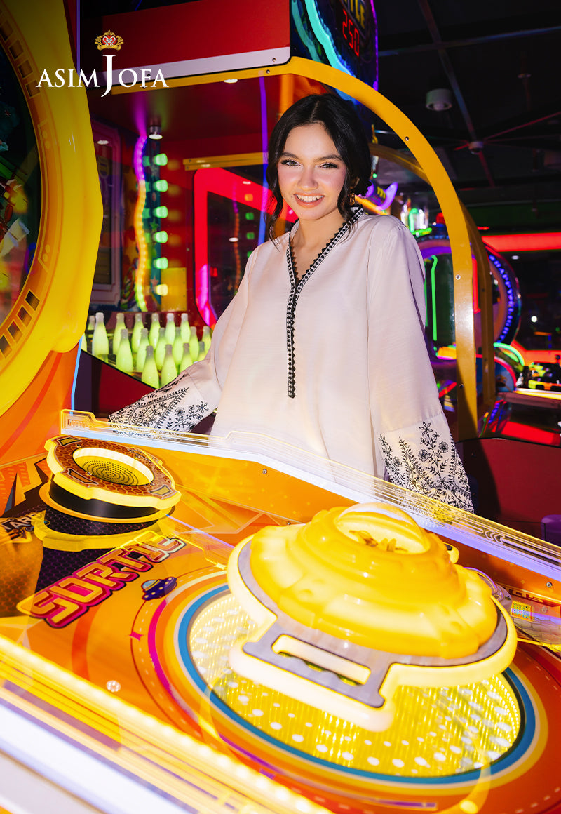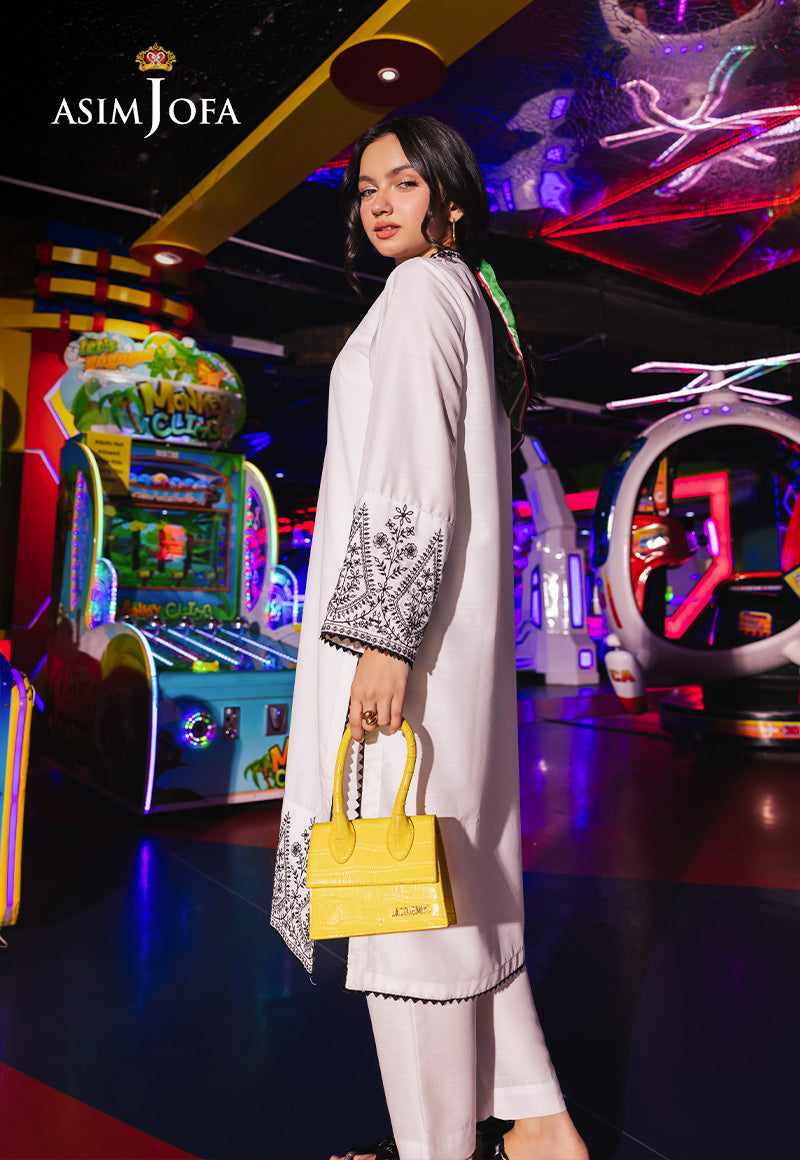 Effortlessly chic, this off-white ensemble is a wardrobe winner. The elegant neckline is complemented by black embroidery that graces the borders and sleeves, adding a touch of drama. Versatile enough for any occasion, this dress transitions seamlessly from formal to casual.