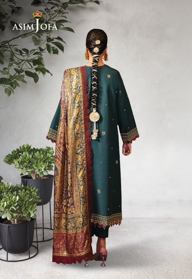 Unleash cascades of charm and glory with this bottle green magnificence that promises an illustrious display of refined taste. The shirt features a masterwork of artisanal craftsmanship that stimulates your attention with its artful embroidery gracing the neckline and border alongside delicate floral motifs dispersed across the shirt complemented by intricate work on the sleeves. Paired with lurex dupatta that depicts shimmer of serenity through gorgeous paisley pattern in gold, enhancing the overall look of this ensemble.