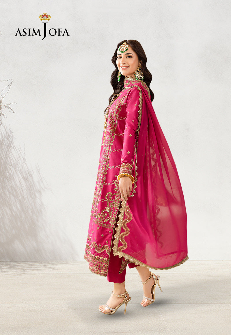 Yumna Zaidi sparkles in this in this blooming number from ‘The Meerub’. The embroidery on this garment is like a constellation of stars, each one shining with its unique radiance. The golden zari and sequins add a touch of celestial sparkle, while the shocking pink poly lawn forms a soft and feminine backdrop. The chiffon dupatta adds an ethereal quality, as if one could wrap themselves in the very cosmos. The Asim Jofa look you should steal!