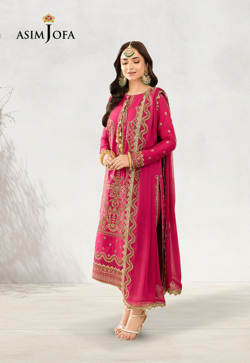 Yumna Zaidi sparkles in this in this blooming number from ‘The Meerub’. The embroidery on this garment is like a constellation of stars, each one shining with its unique radiance. The golden zari and sequins add a touch of celestial sparkle, while the shocking pink poly lawn forms a soft and feminine backdrop. The chiffon dupatta adds an ethereal quality, as if one could wrap themselves in the very cosmos. The Asim Jofa look you should steal!