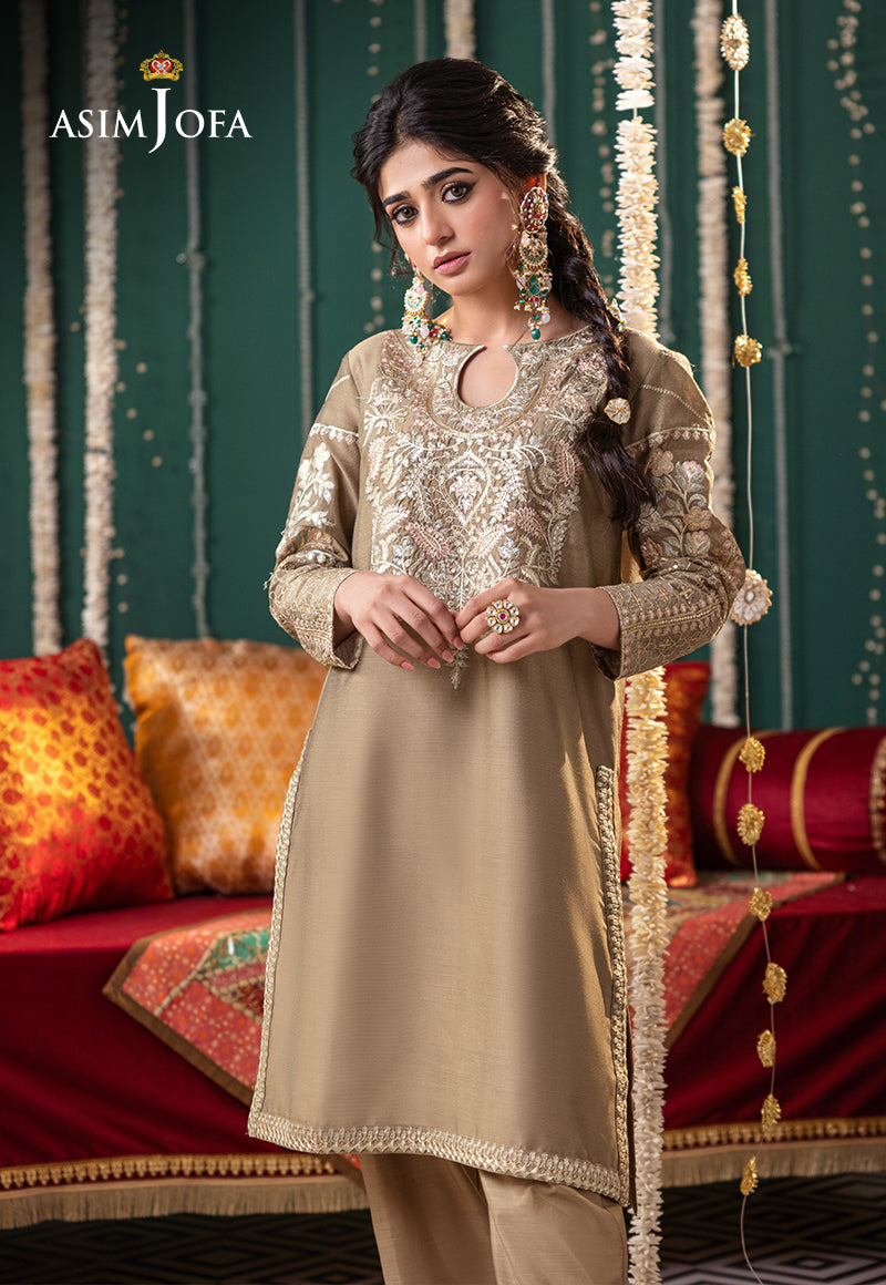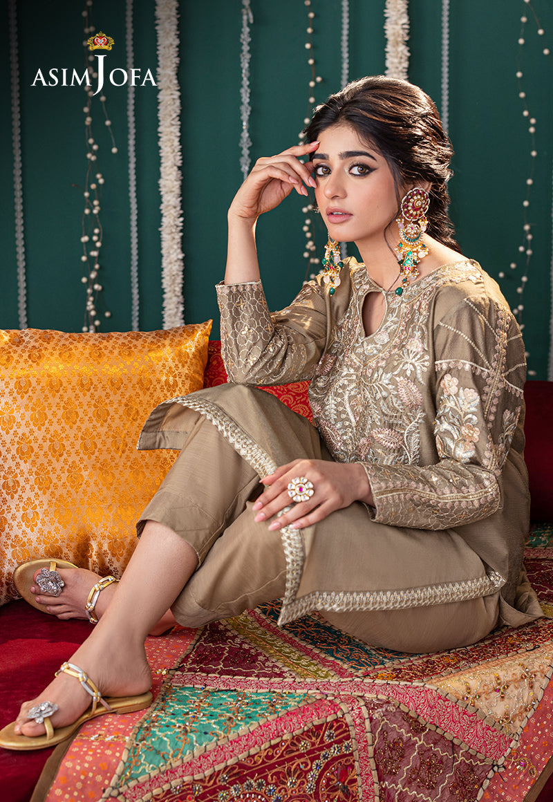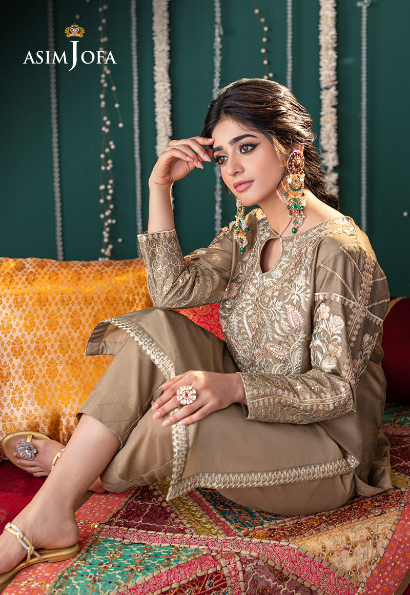 This olive-green ensemble with intricate embroidery adorned with sequins on the neckline and sleeves, creating a magical allure.