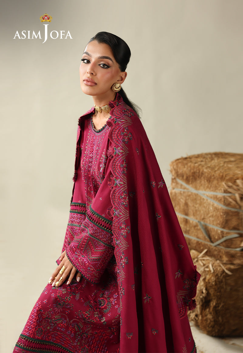 Capturing the magic of a winter? sky being a canvas of fleeting wonder, this deep fuchsia outfit becomes a reflection of that evening. The embroidered shirt is elevated with threads of purple, bottle green, pistachio, and vivid shocking pink, echoing the shifting hues of twilight over the valleys of Kashmir. Paired with exquisitely embroidered trousers and a matching shawl, the ensemble flows with the serene drama of the evening sky, blending tradition and artistry into a statement of refined winter elegance.
