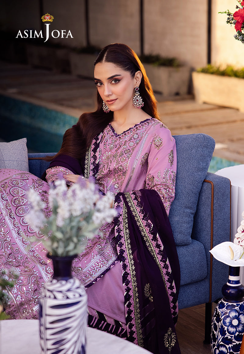 Unshackle your beauty with this attire, where every thread and fiber celebrates the unbridled you. Rich embroidery on this lilac shirt creates a tapestry of self-expression, featuring thread work in a coordinated palette of deep purple, mauve, and green shades enhanced by antique silver Zari work in the gleaming presence of 5mm and 3mm sequins. The deep purple dupatta accentuates the whole ensemble with its simplicity as embroidered motifs grace each corner, elevating the elegance of this outfit. The pastel hues combined with vibrant tincture come together in a graceful dance of liberation.