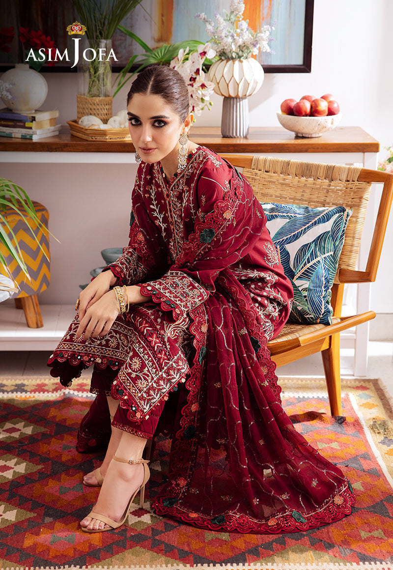This maroon dress is a sanctuary of self-discovery, unlocking the secrets of inner strength. The shirt’s opulent embroidery and thread work converge like a river of creativity with rust, beige, dark green, and coral hues blossoming together in the company of shiny sequins, unfurling a petals-of-fire tapestry that defines the beauty of femininity. Paired with an elegant chiffon dupatta featuring subtle embroidery beautifully complements the ensemble. Donning this attire is like kindling the embers of your inner flame, illuminating the path to empowerment