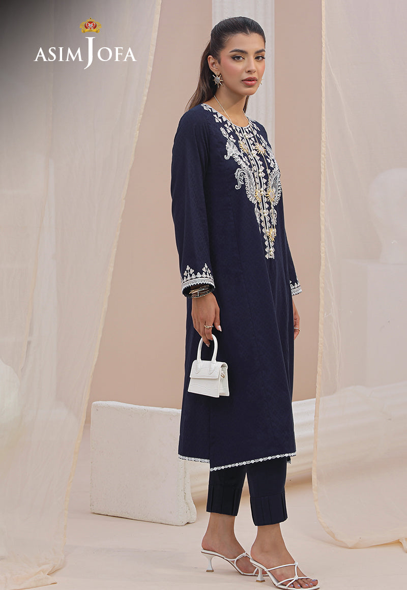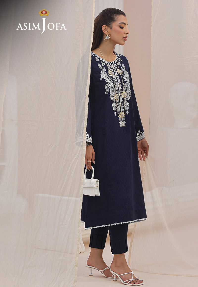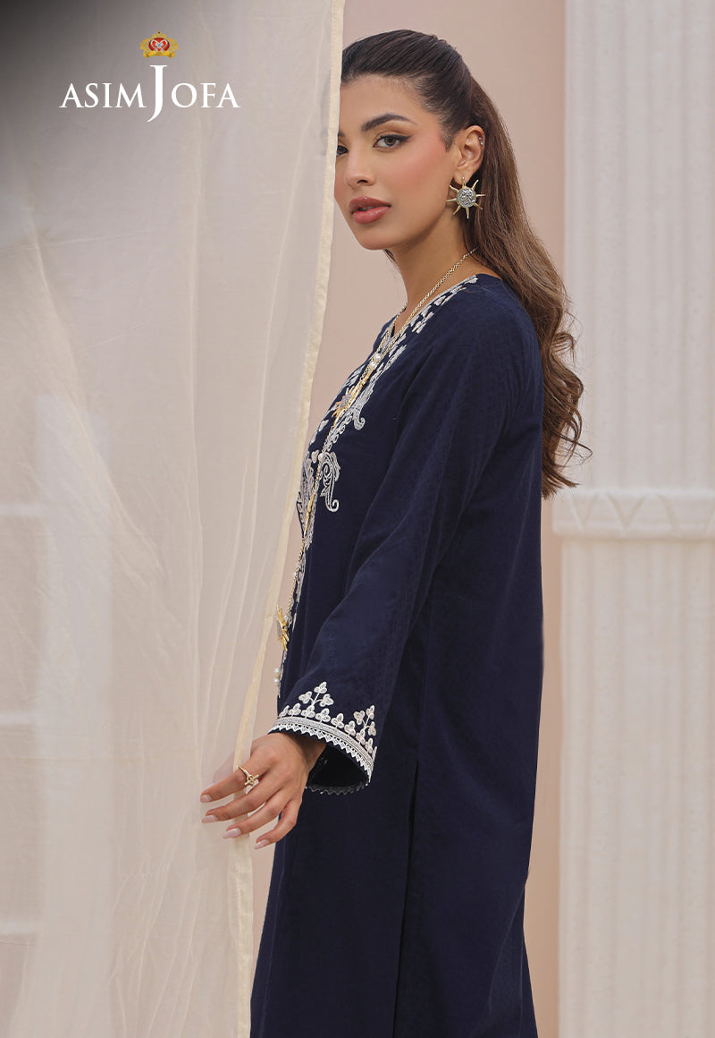 Envelop yourself in elegance with this navy blue self-jacquard shirt, featuring ivory-colored bold thread embroidery that gracefully adorns the neckline and borders, creating a harmonious composition.