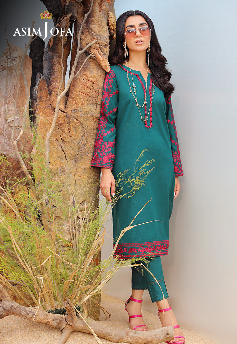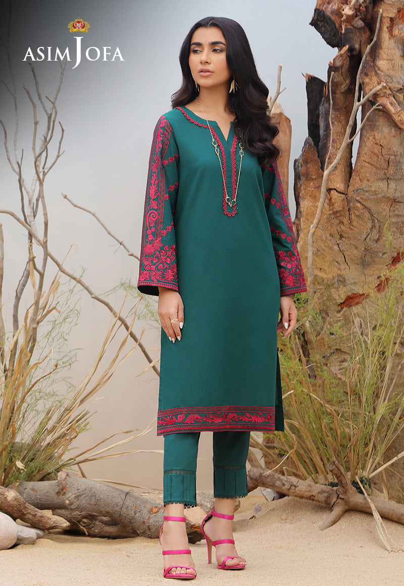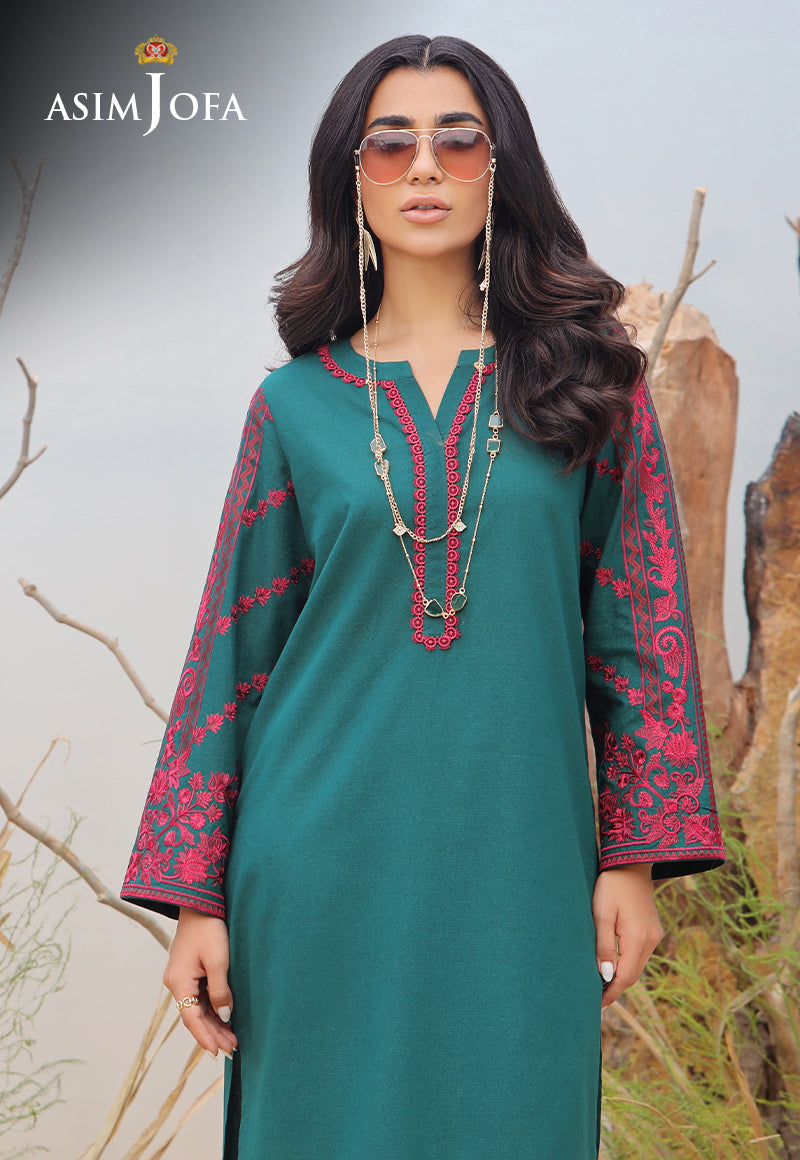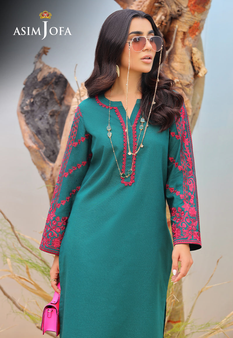 Explore the depths of elegance with this Persian green self-jacquard shirt, featuring intricate fuchsia-colored embroidery accentuated on sleeves and borders, complemented by a subtle Arabesque design on the neckline.