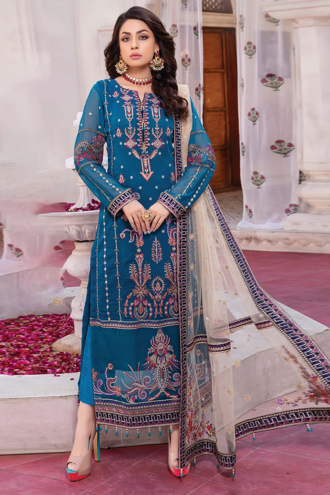 Semi Stiched Shirt Crinkle Chiffon Embroidered and Hand Embellished Embroidered Sleeves 34 Inches. Organza Embroidered Hand Embellished Dupatta 2.5 Yard...