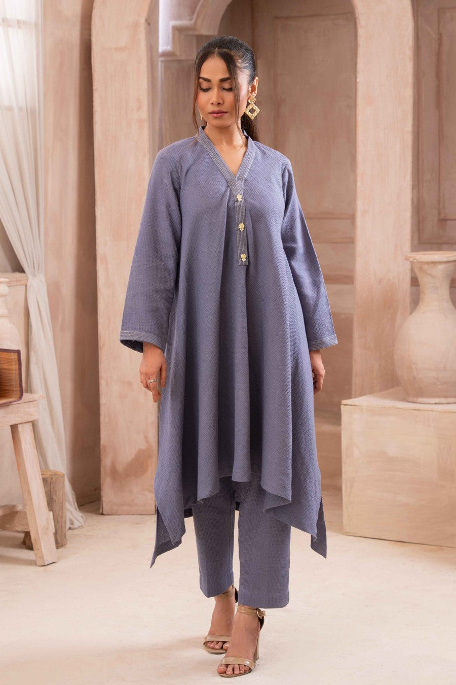 Aqua Gold this captivating article features an A-line tunic with a V-neck, all detailed with gold stitches and finished with gota flowers and some timeless cigarette pants.